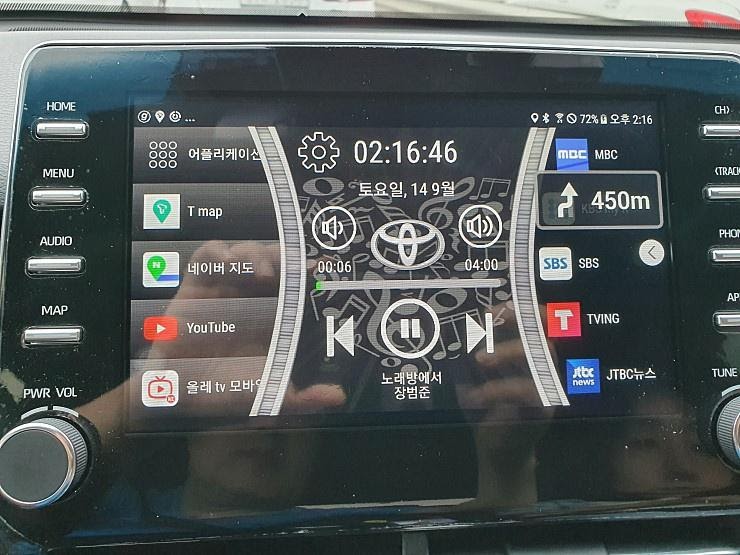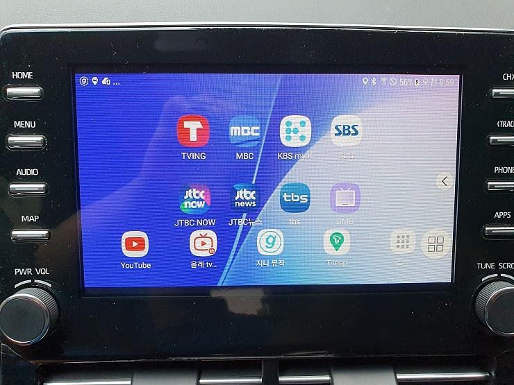 메뉴가 아닌, 안드로이드 첫화면으로도 갈수 있음... 아래와 같이 나오며, 휴대폰에 설치된 모든 앱을 실행할 수 있다. 차에서는 거의 TV방송, 유튜브, 음악, 네비 만을 사용해서 이 앱들을 맨 첫 화면에 표시하도록 하였다.