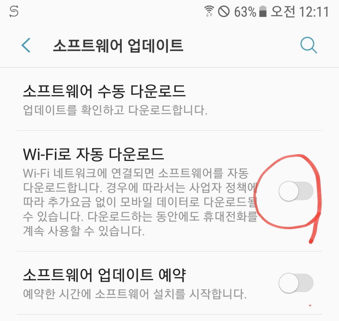 앞의 설정에서 소프트웨어 업데이트를 선택하여 나온 아래 메뉴에서 자동다운로드를 끈다.