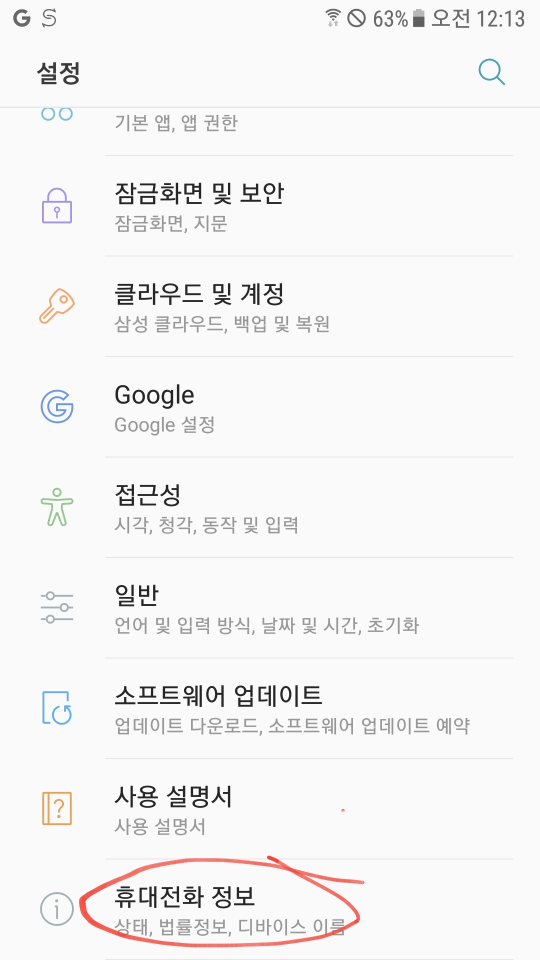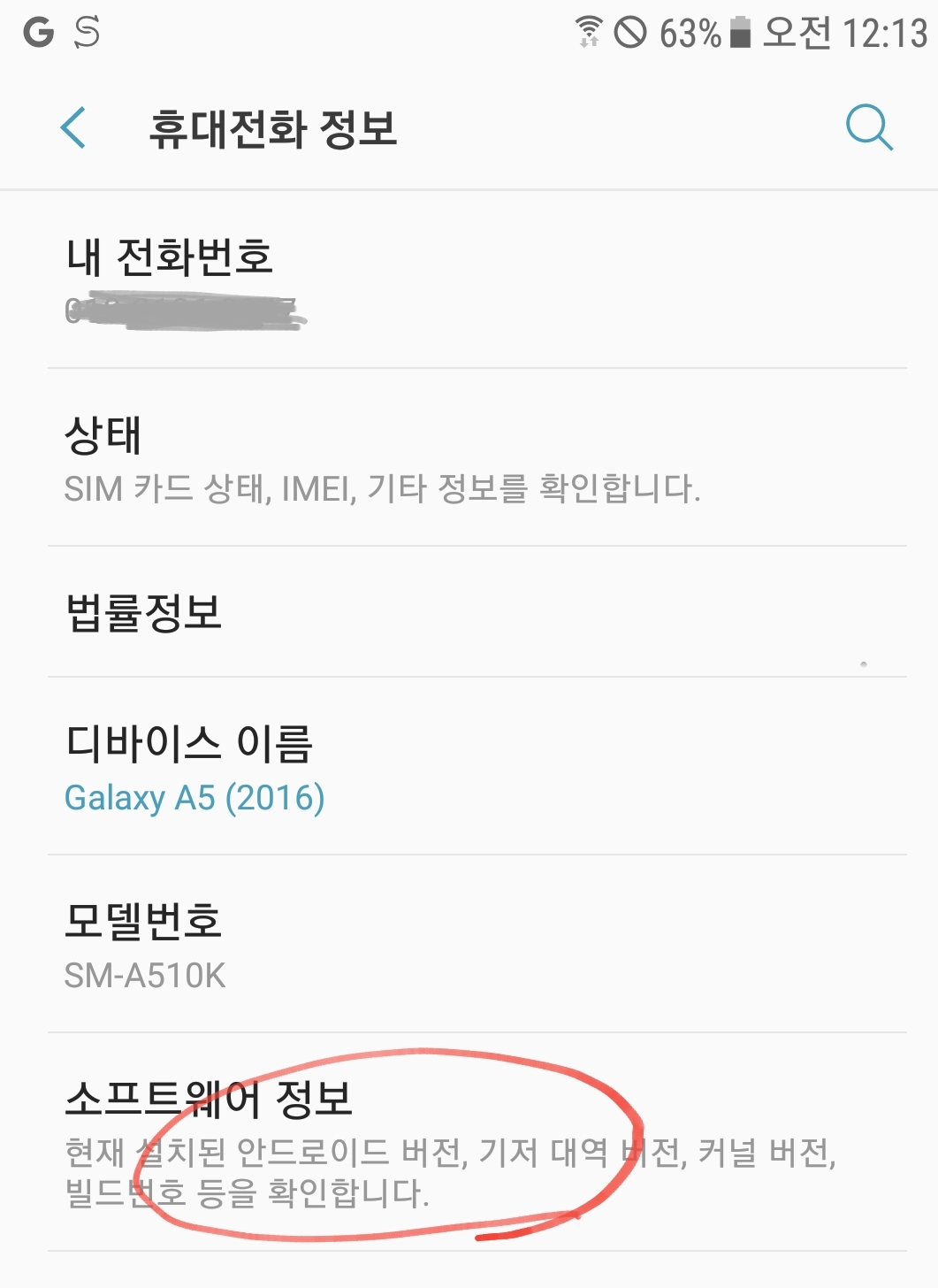 설정의 휴대전화 정보를 선택한다.