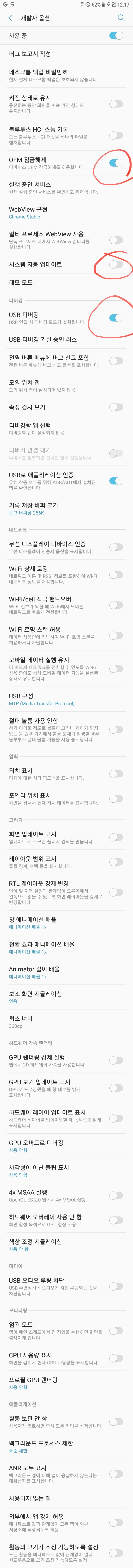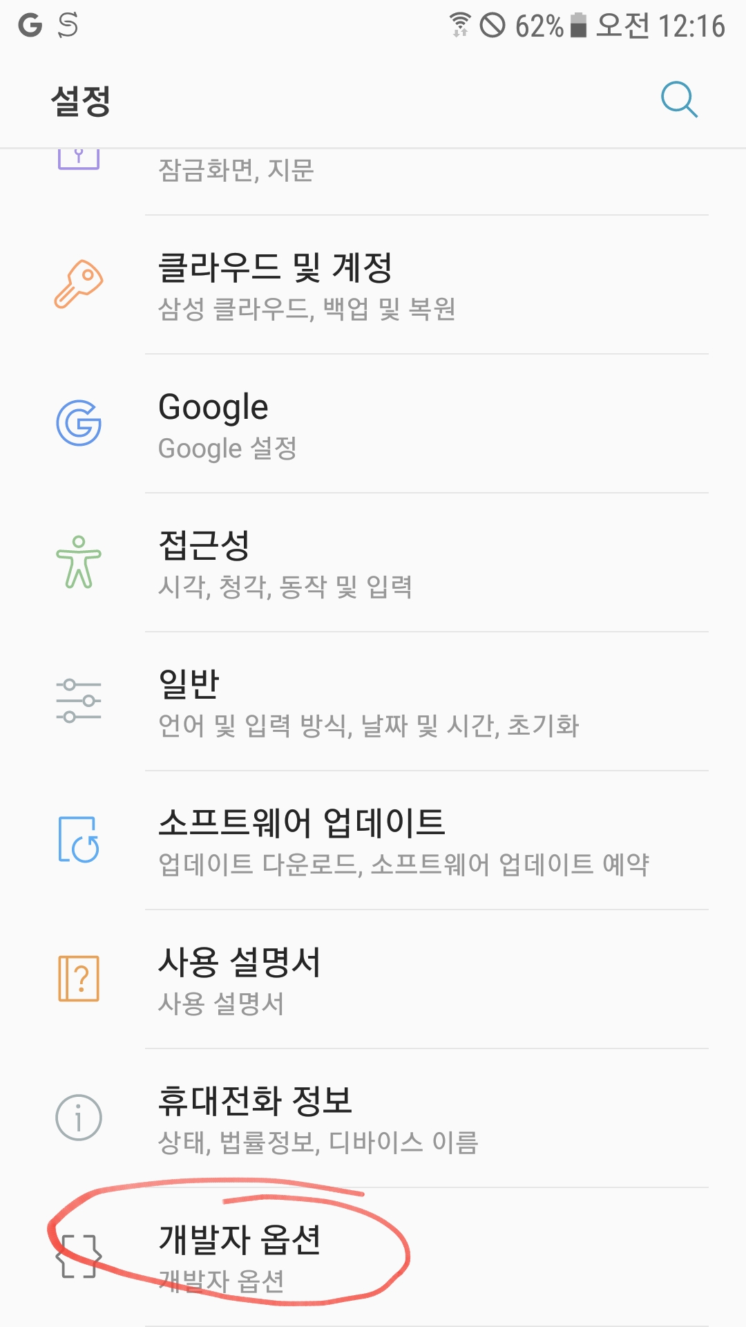 설정 화면에 들어가면, 맨아래에 이전에 없던 메뉴가 하나더 생겨져 있다. 새로 생긴, 개발자 옵션을 선택한다.
