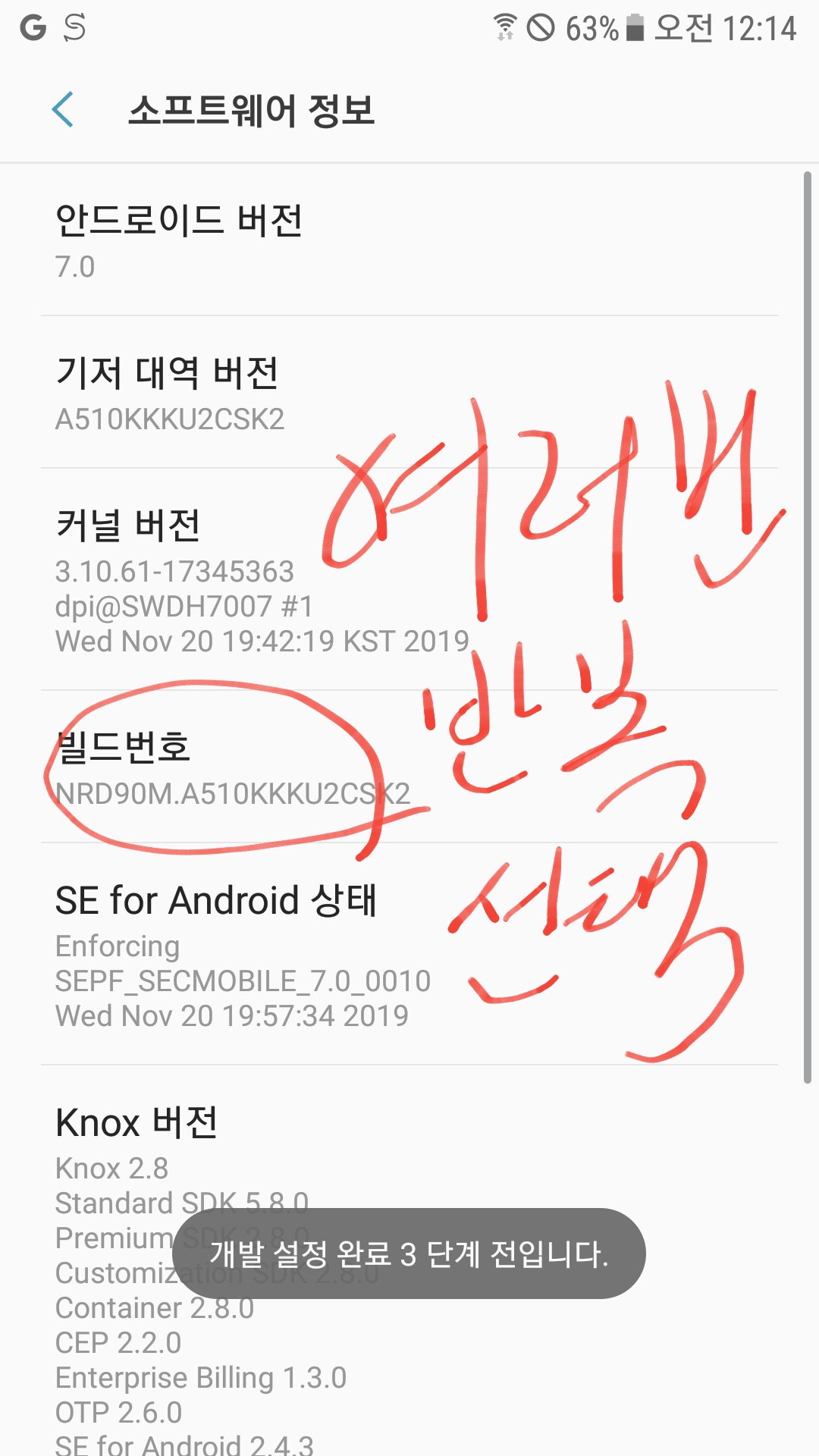 빌드번호 메뉴를 여러번 연타를 한다. 한 대여섯번 누르면 개발자모드를 활성화한다는 토스트 메시지가 나온다. 그 때까지 계속 클릭하면된다.