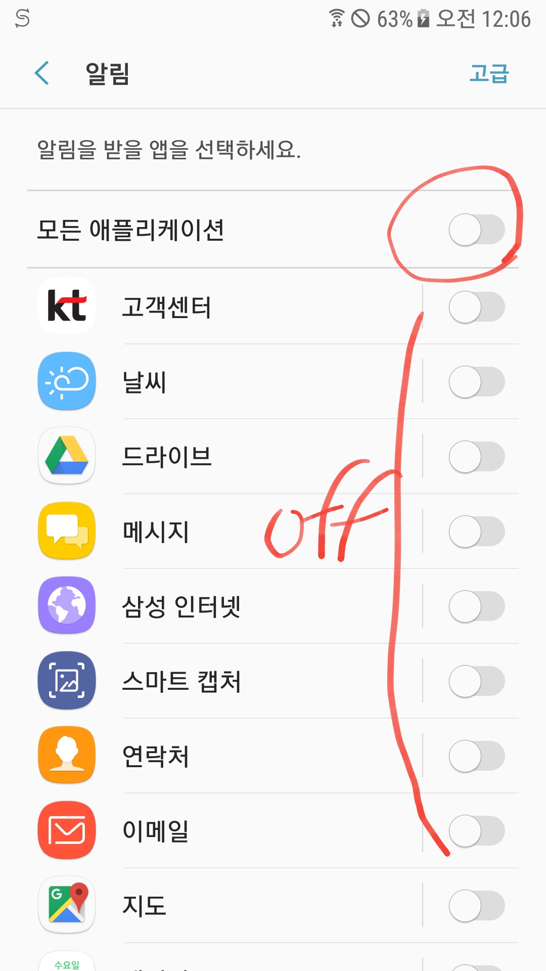 알림 메뉴에서 모든 어플리케이션의 알림을 끈다. 필요한 것이 있다면 On시켜줘도 되지만, 난 차량에서 받을 알림이 없을 것이라 생각하고 모두 끈다. 나중에 필요하면 나중에 켜도 되니까.