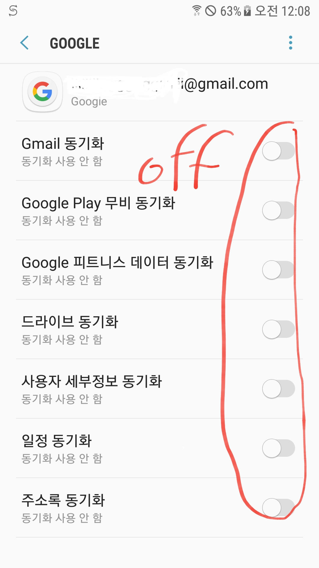 아래 그림과 같이 동기화 기능을 모두 껐다.