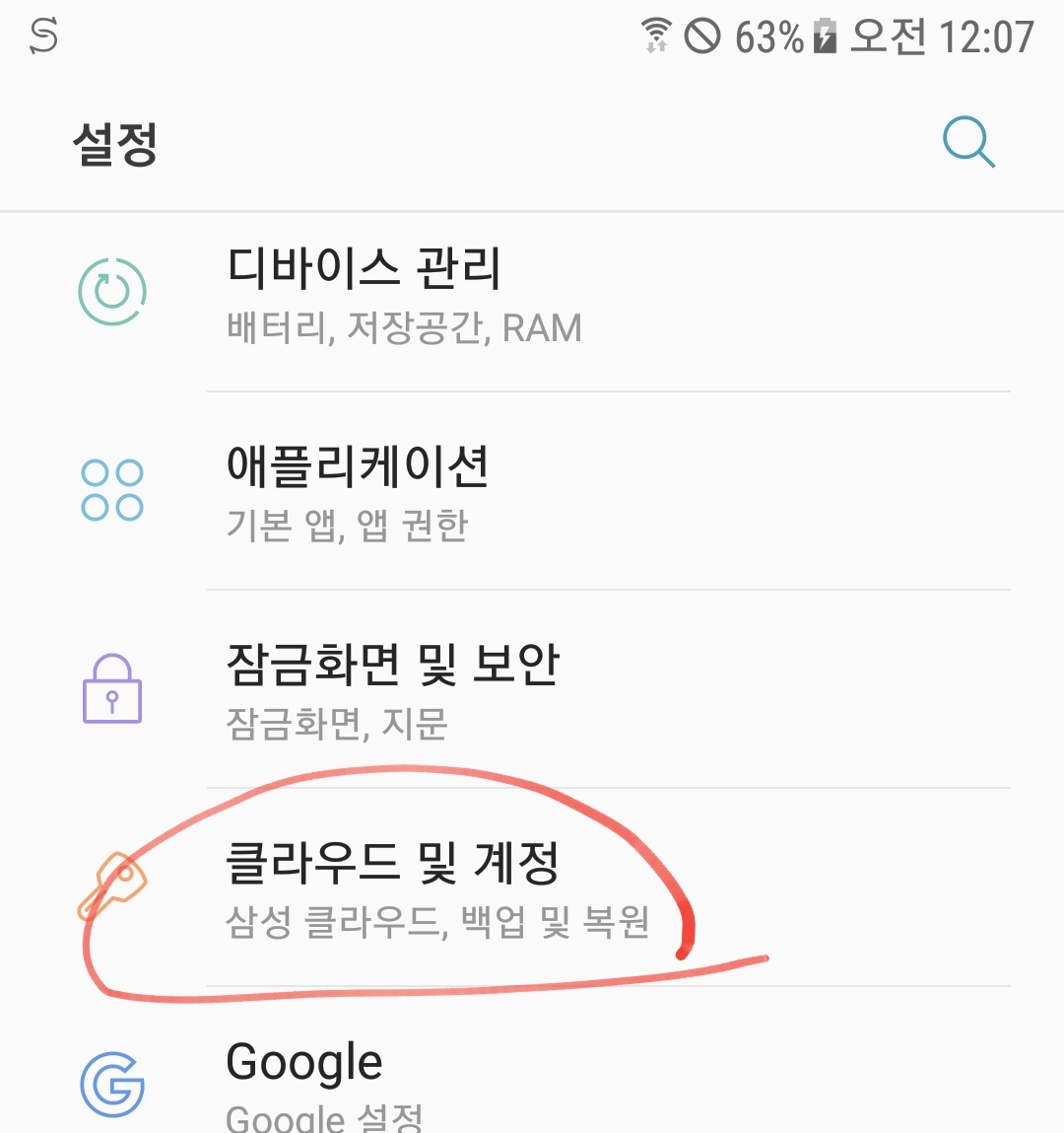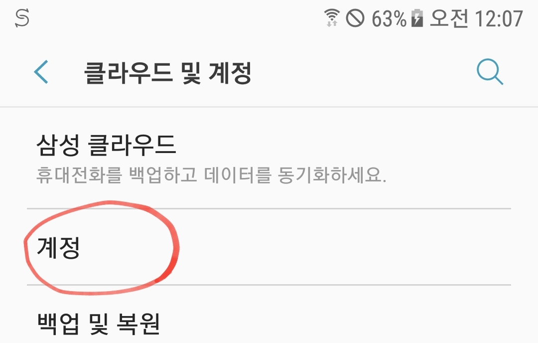 앞의 설정 메뉴에서 " 클라우드 및 계정 "을 선택한다.