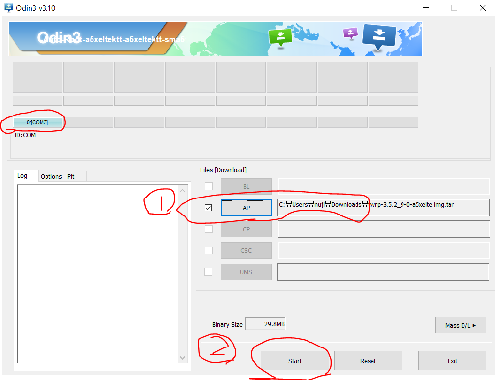 휴대폰을 USB케이블을 이용하여 PC에 연결하고, 이전에 다운로드 받아두었던 오딘을 실행하고, TWRP이미지를 AP에 등록한다.
