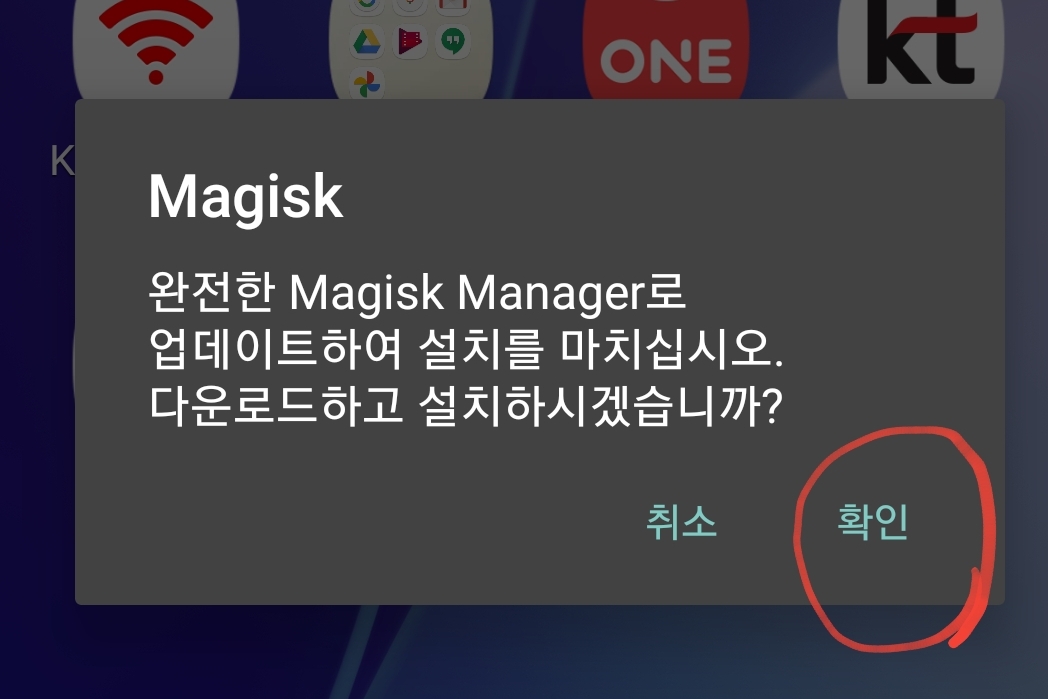 magisk manager가 설치되지 않은 메시지가 나오고 확인을 눌러서 설치를 진행한다.