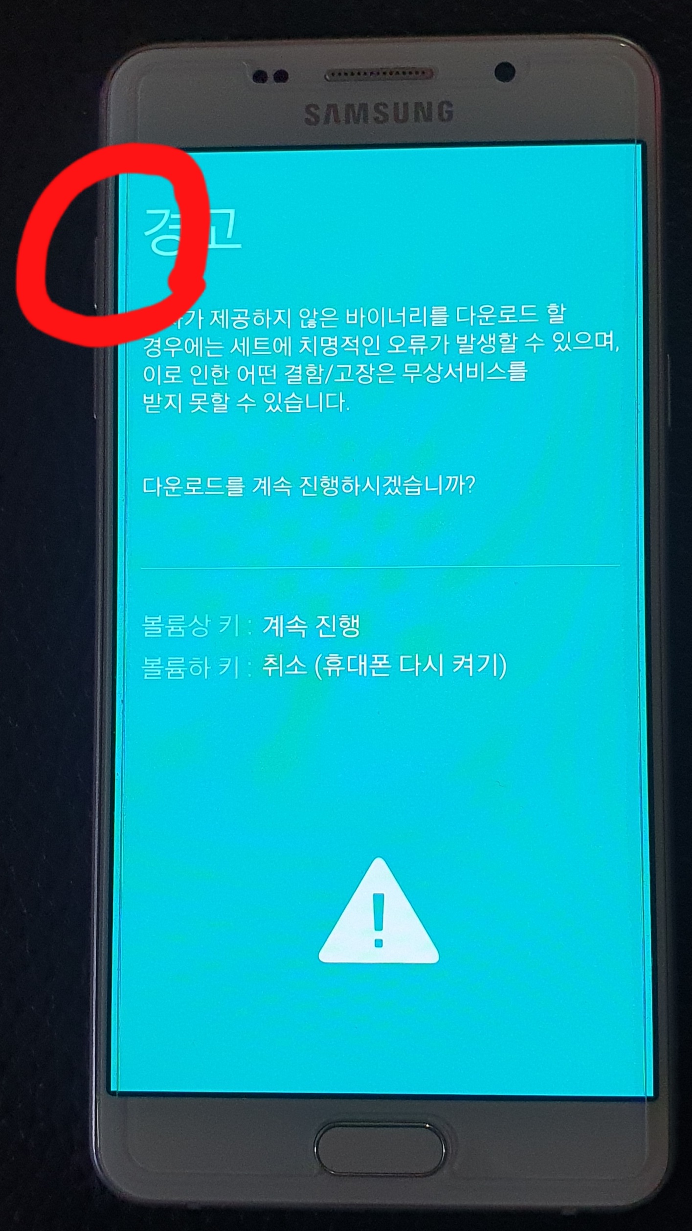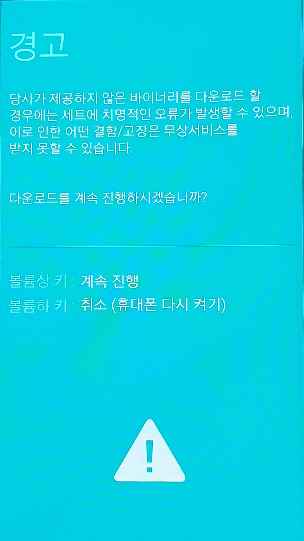 위의 안내와 같이, 볼륨키 상을 눌러서 다운로드 모드로 접속하도록 한다. 아래 그림의 버튼을 누른다.