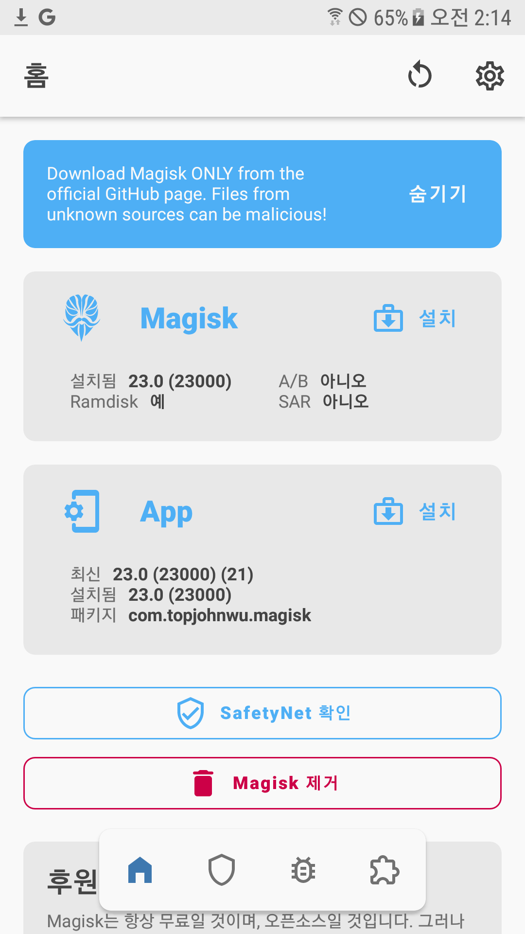 설치가 완료된 후, magisk 앱을 재실행하면 아래와 같이 magisk와 앱이 설치된 것으로 표시되면 정상으로 완료된 것이다.