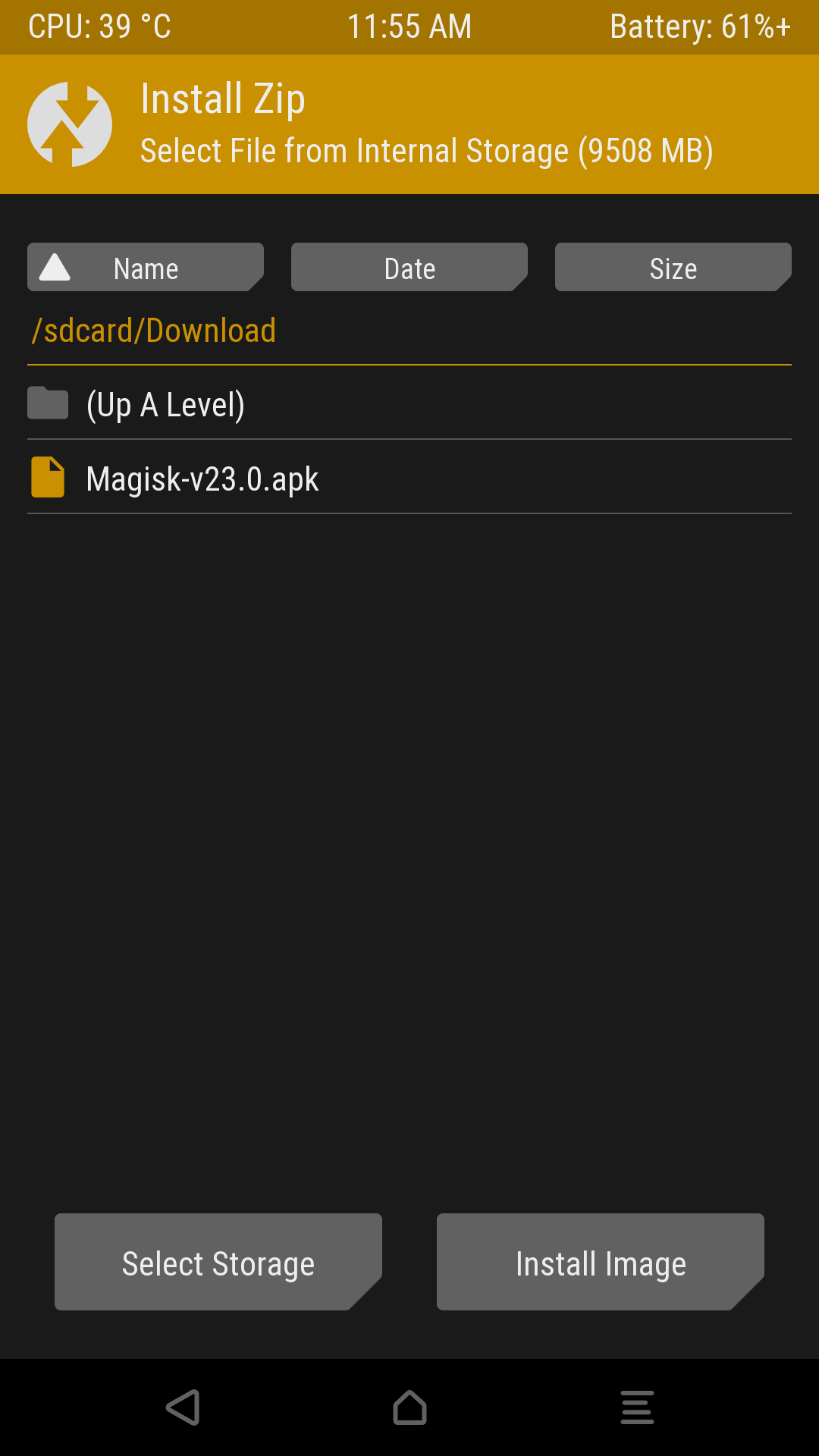 표시된 폴더 중에서, magisk파일을 다운로드 받은 폴더로 이동하여 설치할 magisk파일을 선택한 후, 우측 하단의 Install Image를 선택한다.