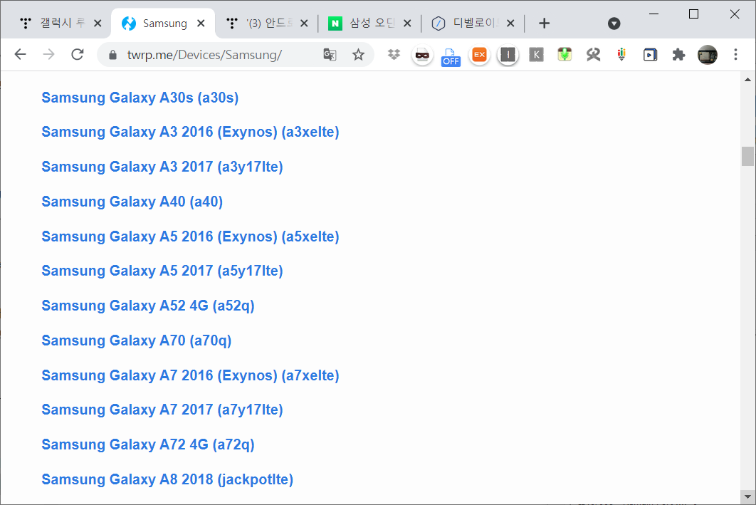 삼성갤럭시A5 2016의 경우에는, Samsung을 찾아서 선택하면 아래와 같이 단말 모델 리스트에서 갤럭시 A5 2016 (Exynos) (a5xelte) 를 선택한다. (본인 폰에 맞는 항목을 찾아서 선택해야 한다)