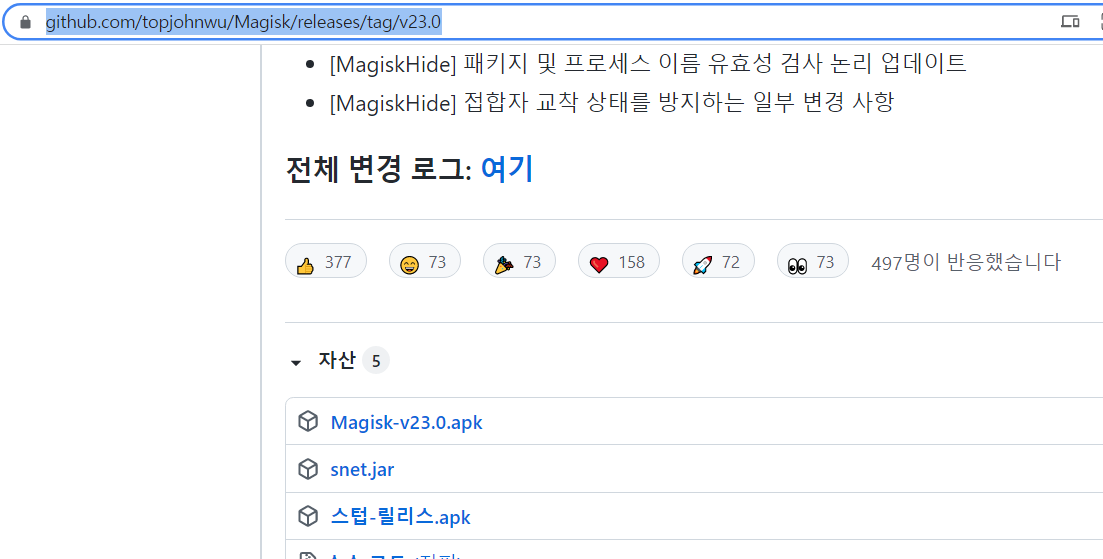 아래 주소로 접속하여 Magisk 안내 페이지의 중간즈음에 있는 다운로드를 선택하여, 나온 페이지(최신 버전)의 Asset에 있는 Magisk-vXX.X.apk 파일을 다운로드한다. (휴대폰에 저장해야 한다)