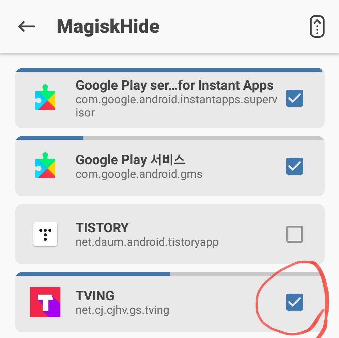 루팅을 속일 대상 앱을 선택한다. 아래 화면처럼 티빙에 체크를 한 후, magisk앱을 종료한다.