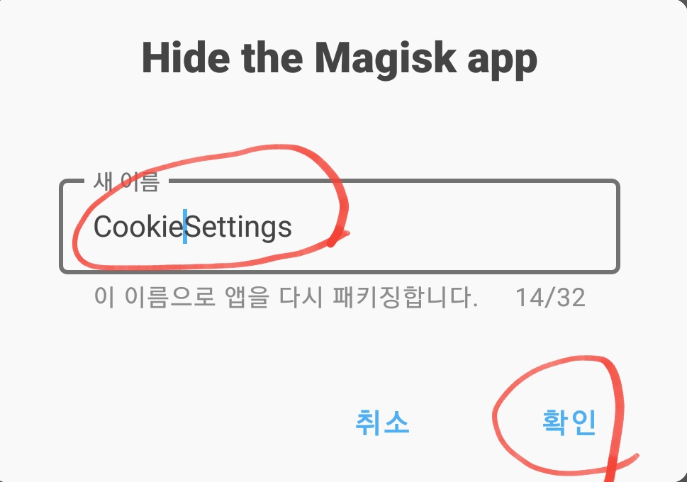 magisk앱의 새로운 이름을 지정한다. 내 경우에는 CookieSettings로 입력하였다.