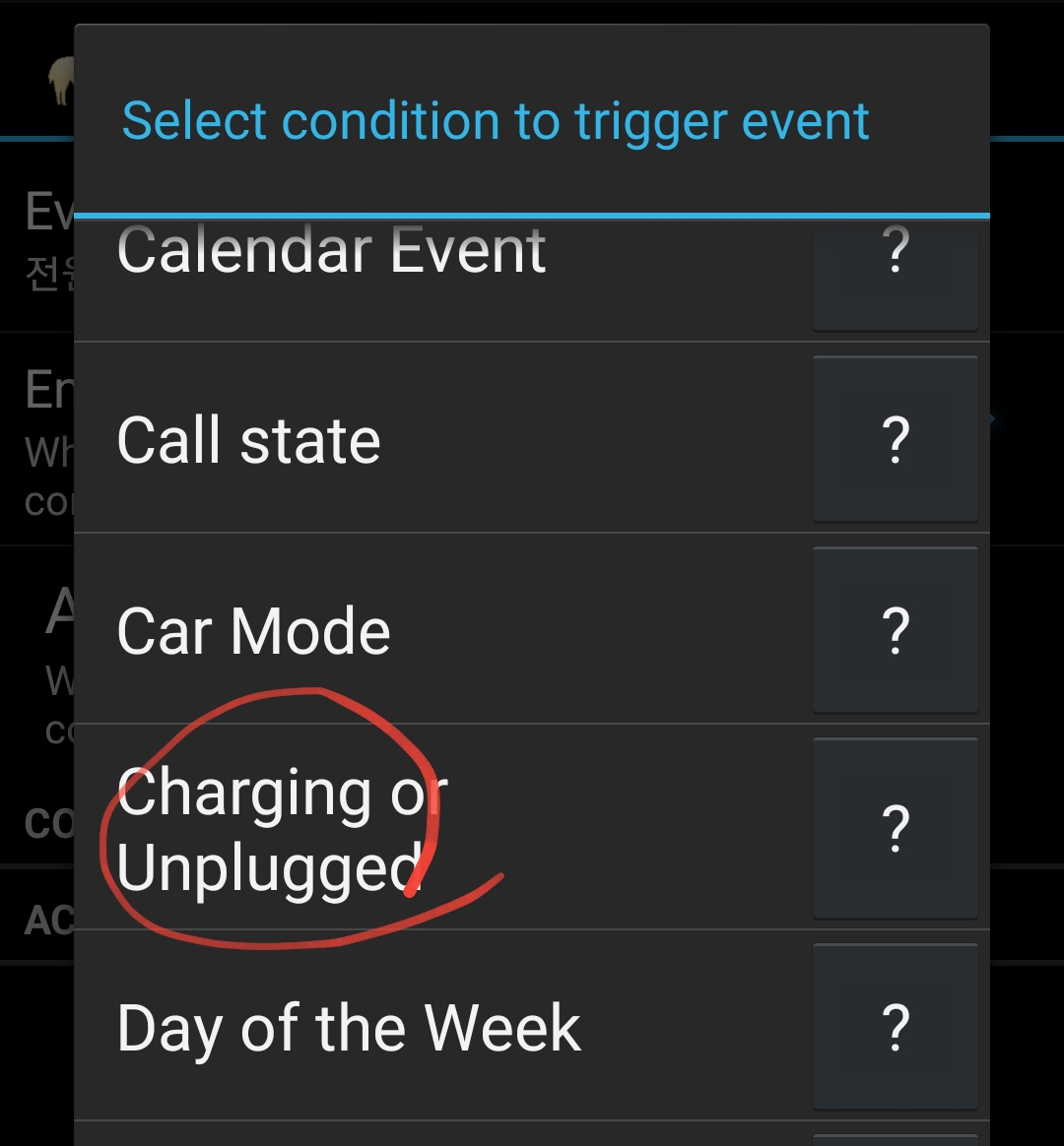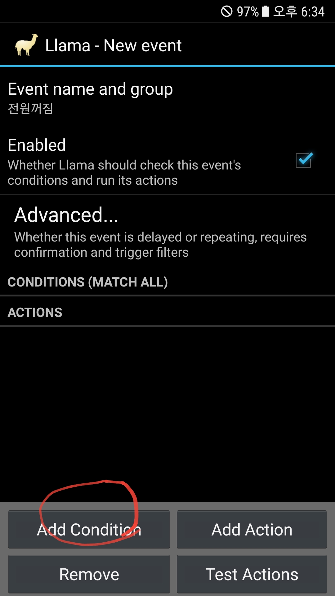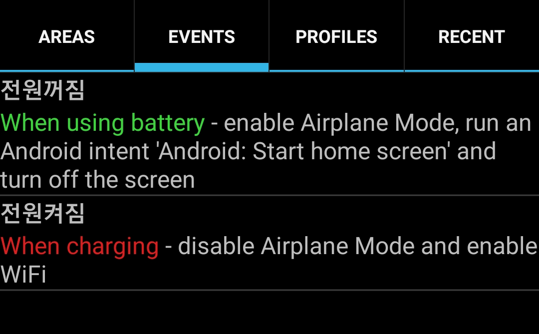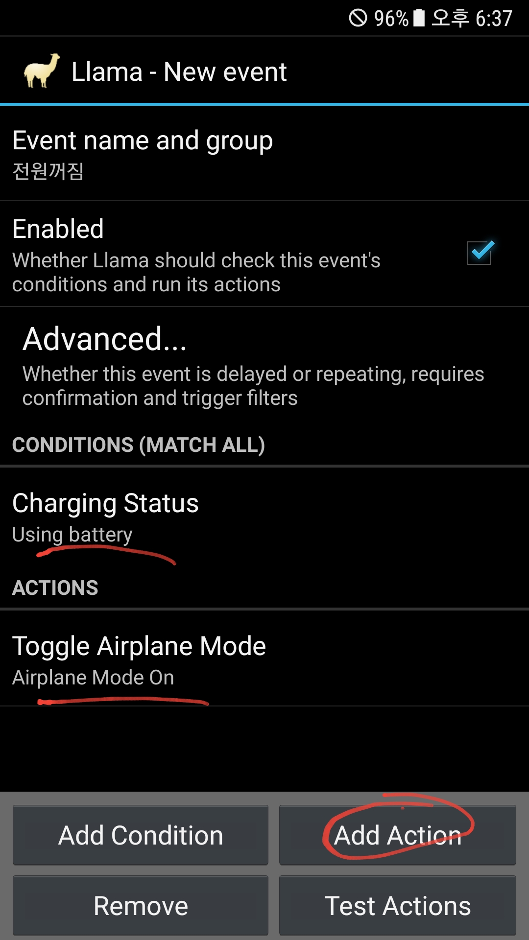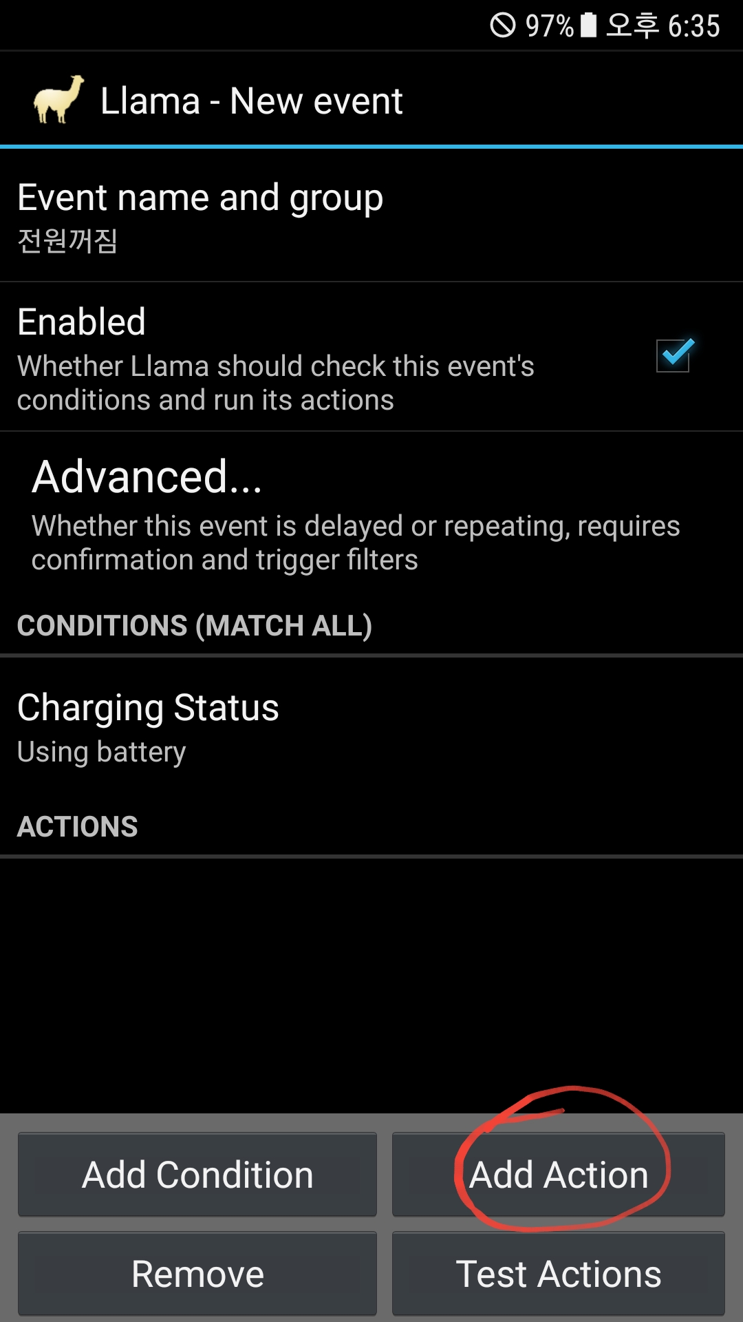 전원연결될 때의 조건 설정이 되었으니, 수행할 액션을 추가한다.