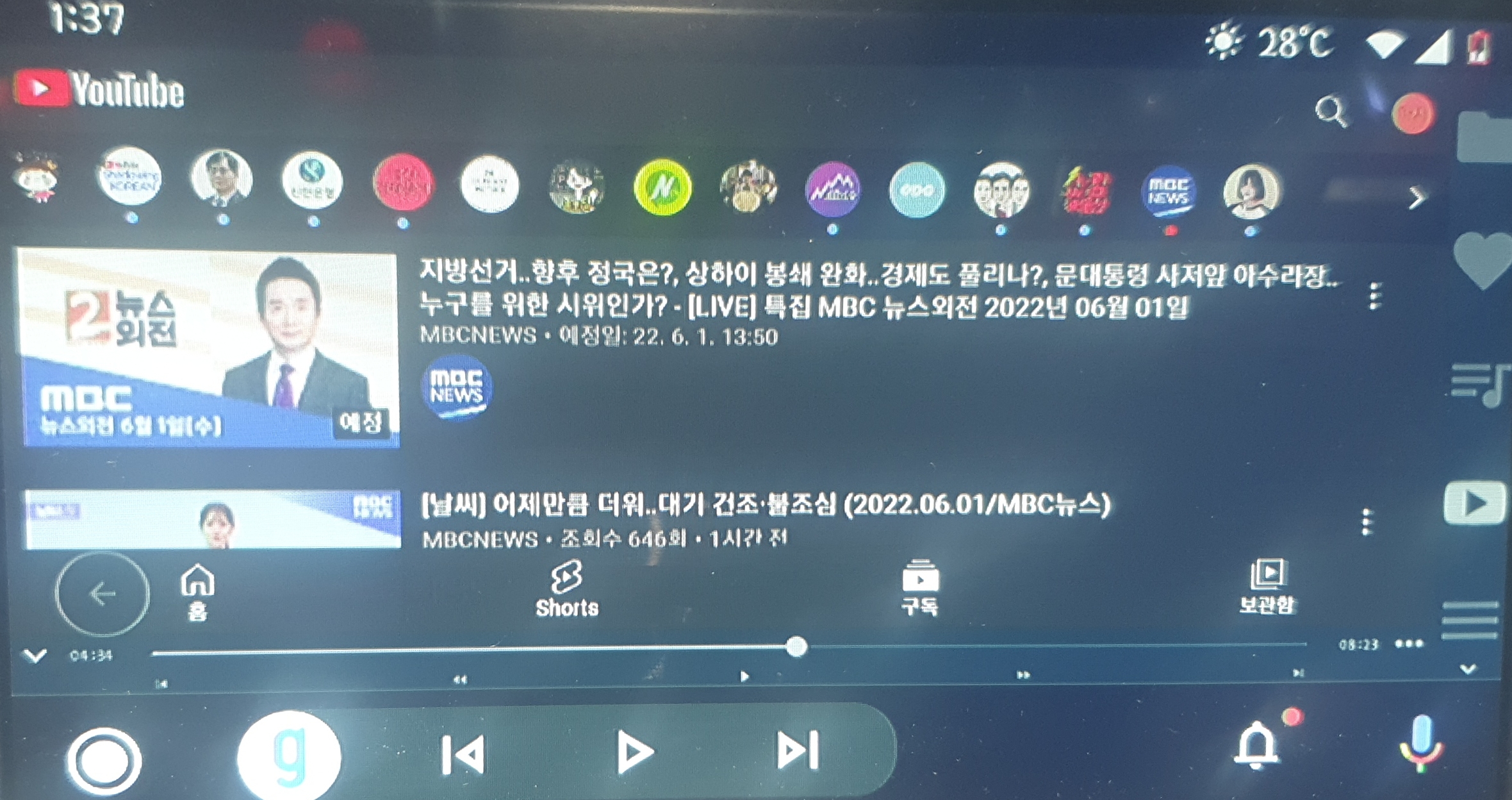 아래 화면은 fermata auto에서 유튜브를 접속한 화면이다. 물론 유튜브 프리미엄을 가입하지 않고도 광고가 나오지 않게 할수도 있다. 당연한 얘기겠지만, 유튜브 프리미엄 가입해서 사용하고 있는데 아무런 문제없이 사용된다. 유튜브 동영상은 전체 화면으로 출력할수도 있다.