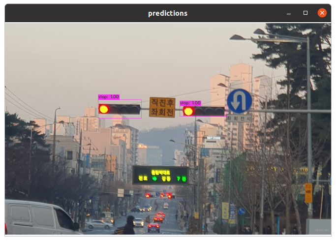 아래와 같이 빨간색 신호등을 "stop"으로 인식하였다.