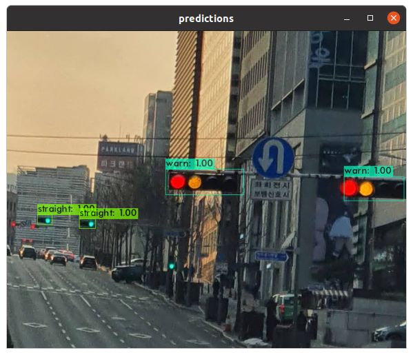 아래 사진은 노란색 신호등을 인식한 경우이다. 노란색 신호는 홀로, 또는 빨간색과 같이, 어떤 경우에는 파란색과 같이도 표시되는 경우가 있다. 이런 경우에도 모두 경고로 인식하도록 하였다.
