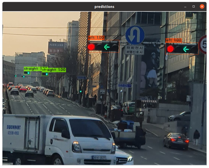 좌회전 신호를 인식한 화면이다. 아래 사진은 멀리서 보이는 직진 신호와 좌회전 신호가 같이 인식되었는데, 최종 판단할 때는 인식된 신호등의 크기가 큰 것을 가까이에 있는 것으로 인식되도록 하여 내 신호를 인식하게 한다.