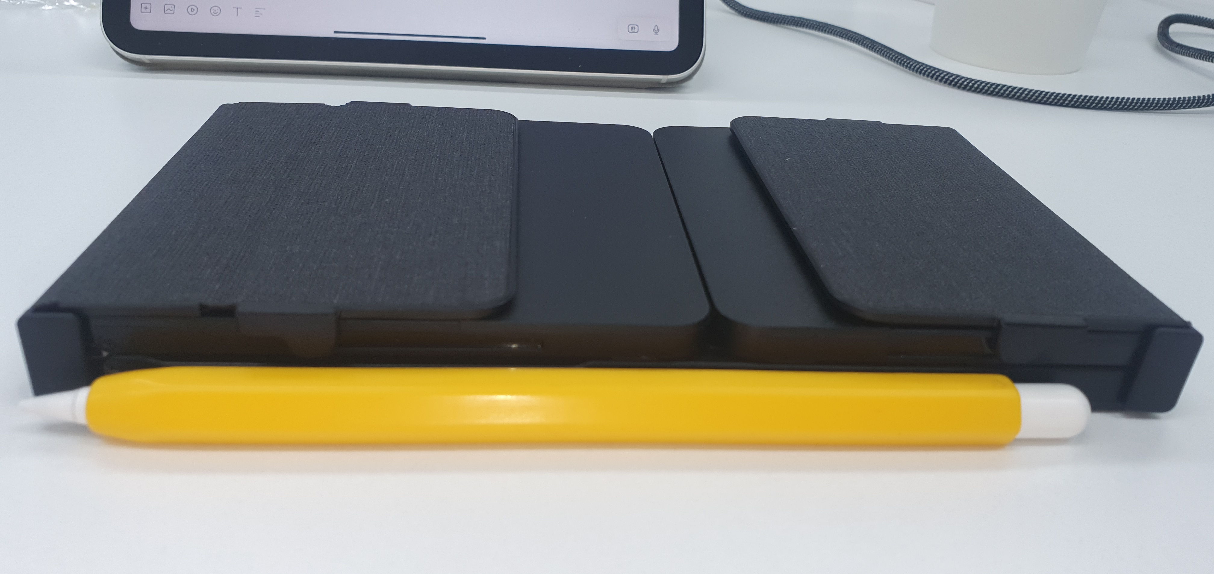 접었을 때의 두께는 아이패드 펜슬 보다 두껍다. 고무를 빼고 비교하면 폈을 때는 아이패드 펜슬 두께 정도 나오고, 접으면 당연히 2배 정도 두껍다.