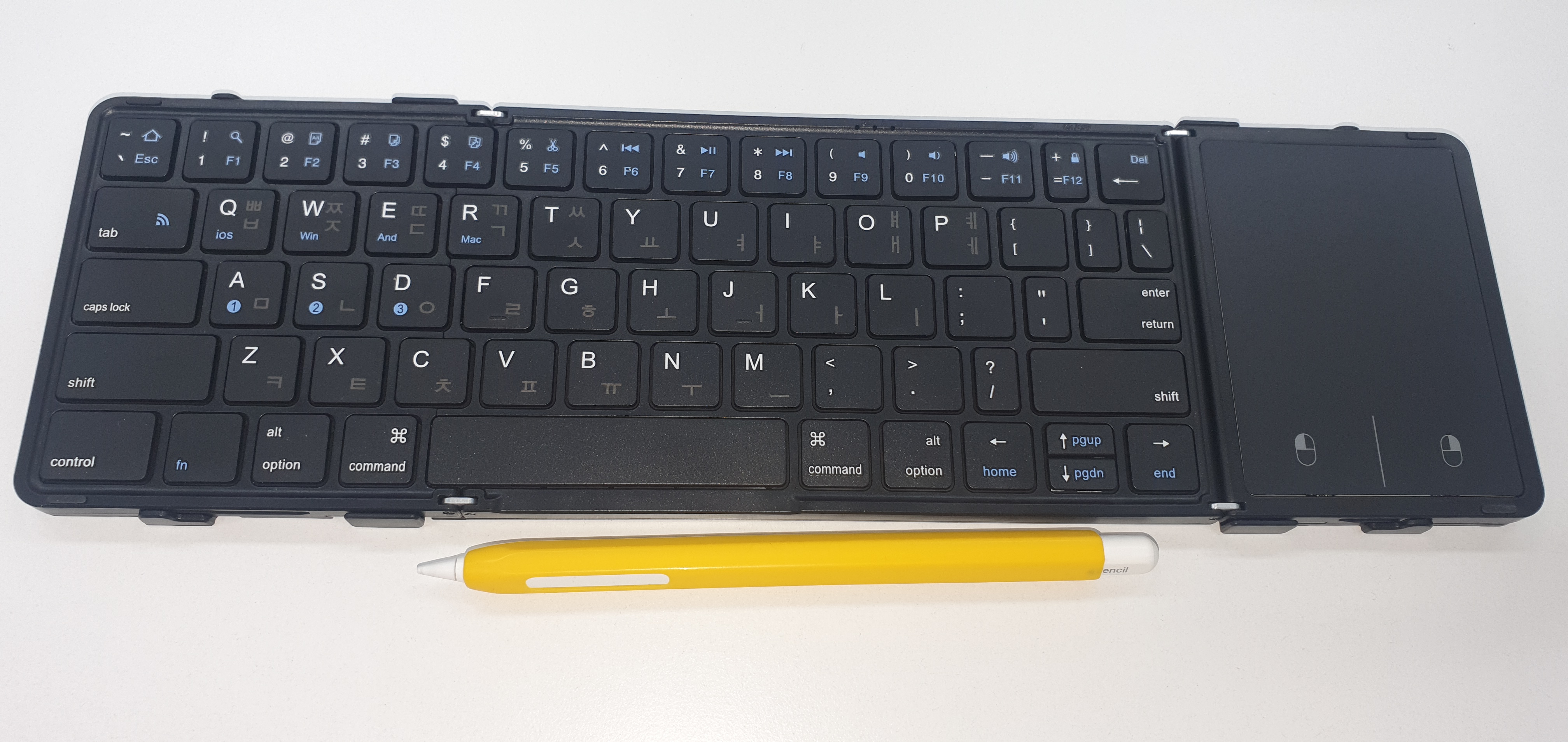 키보드는 일반 키보드 크기와 거의 같아서, 타이핑하는데 불편함이 없게 느껴진다. 게다가 한글 자판도 인쇄되어 있는 제품이다.