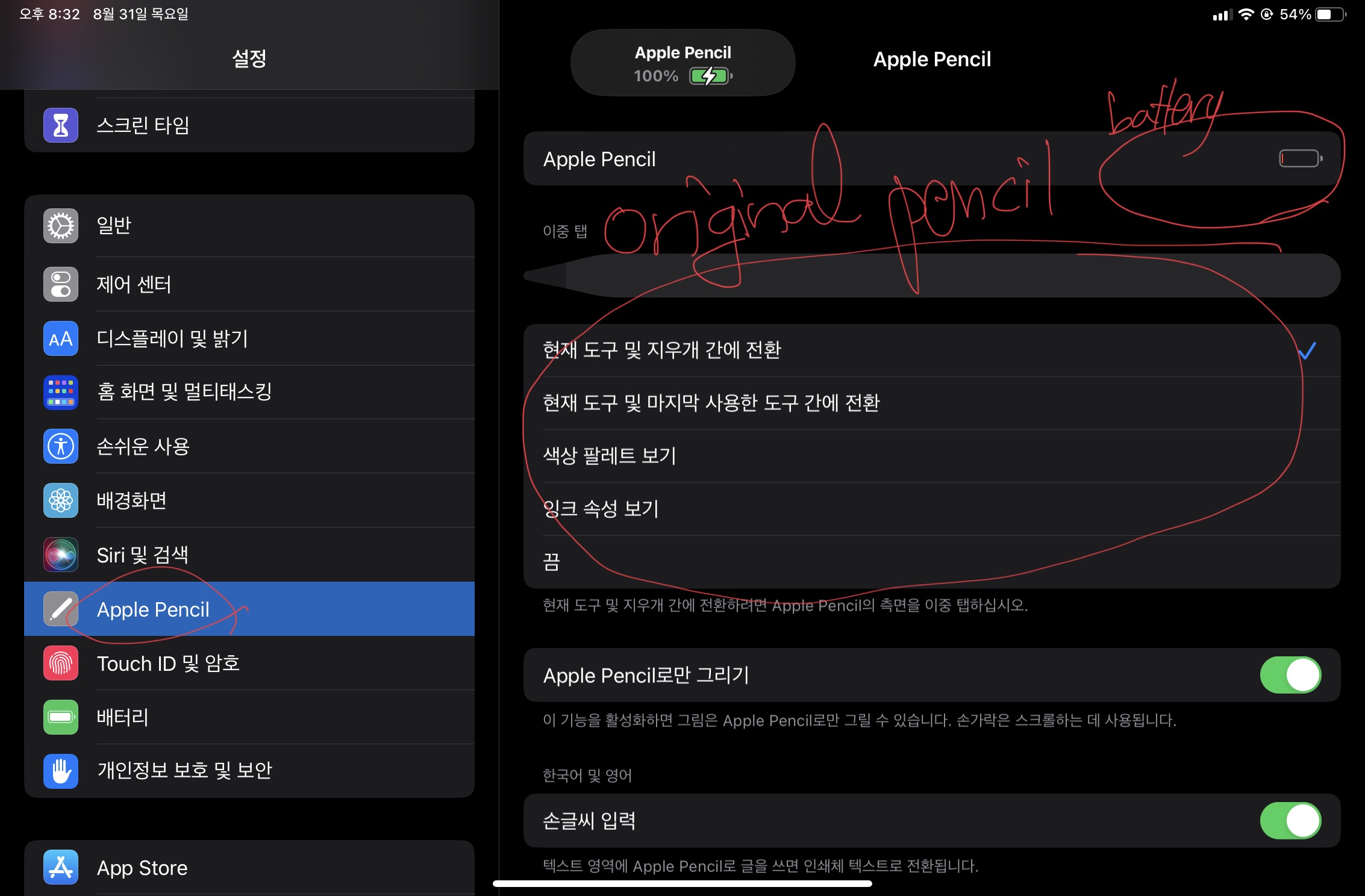 그런 후, 애플펜슬 메뉴에 들어가보면 아래와 같이 나온다. 기존에 있던 메뉴에서 덜 보이는 것 같다.