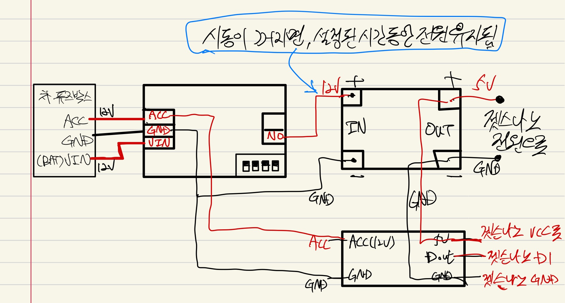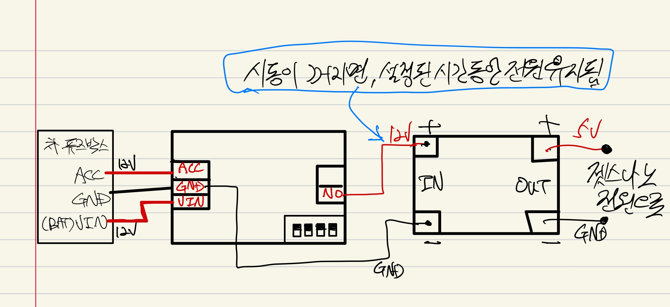 아래와 같이 연결하면, 시동이 꺼지더라도 설정된 시간 만큼 전원이 유지되도록할 수 있다.