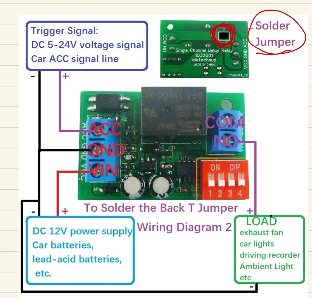 먼저, 알리에서 타임지연회로를 구매했다. 12v 용으로 20A까지 지원하는 모듈이다. 지연시간은 딥스위치를 조합하여 0.5초에서 120초까지 설정할 수 있다.