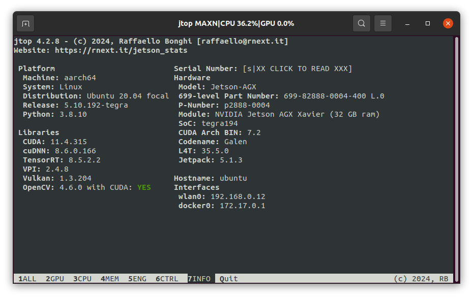 설치를 완료 한 후에, jtop을 실행하면 아래와 같이 OpenCV 가 CUDA를 지원하는 것으로 표시되어 있게 된다.