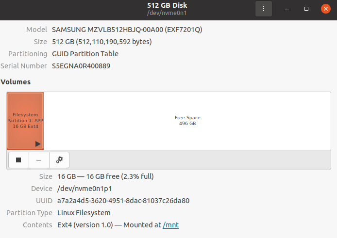 /mnt 에 마운트 된 것은 아래 화면에서 확인한다. 아래 그림은 참고로만 넣었다. 아래는 16GB만 APP파티션으로 되어있는데, 실제로는 전체가 잡히도록 하였다. 내 경우에는 명칭은 APP이 아닌, SSD로 정했다.