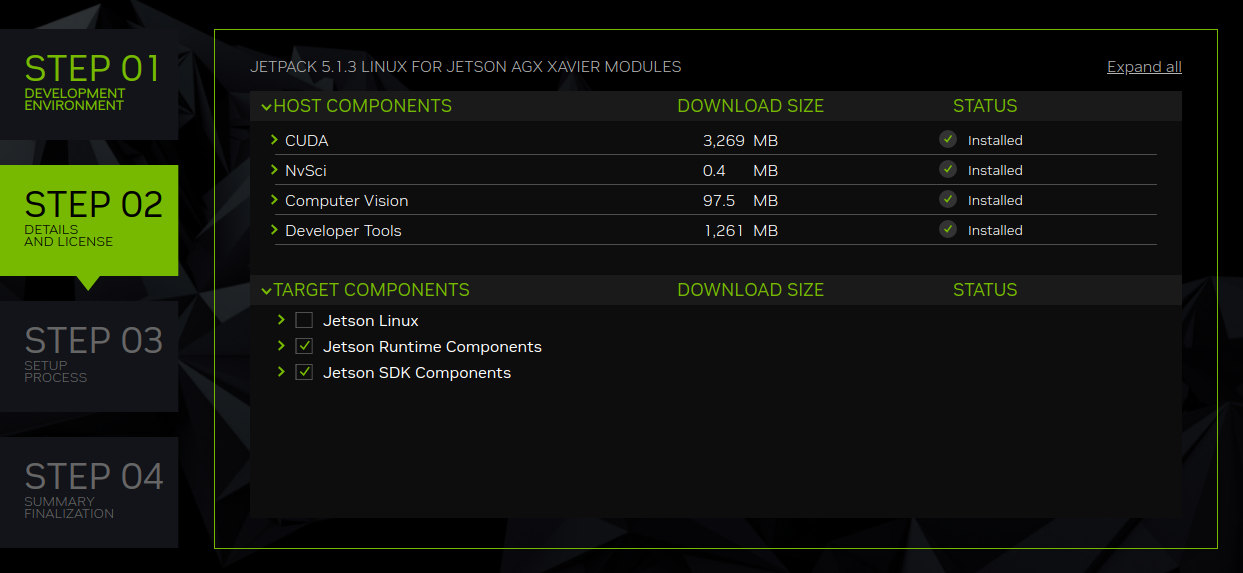 host서버에서 sdkmanager를 실행하고 JetPack SDK 5.1.3과 Additional SDKS를 선택하였다. [STEP2]에서는 Target components의 "Jetson Linux"를 선택제외하고 나머지는 모두 선택하여 패키지들만 설치를 하게 하였다.