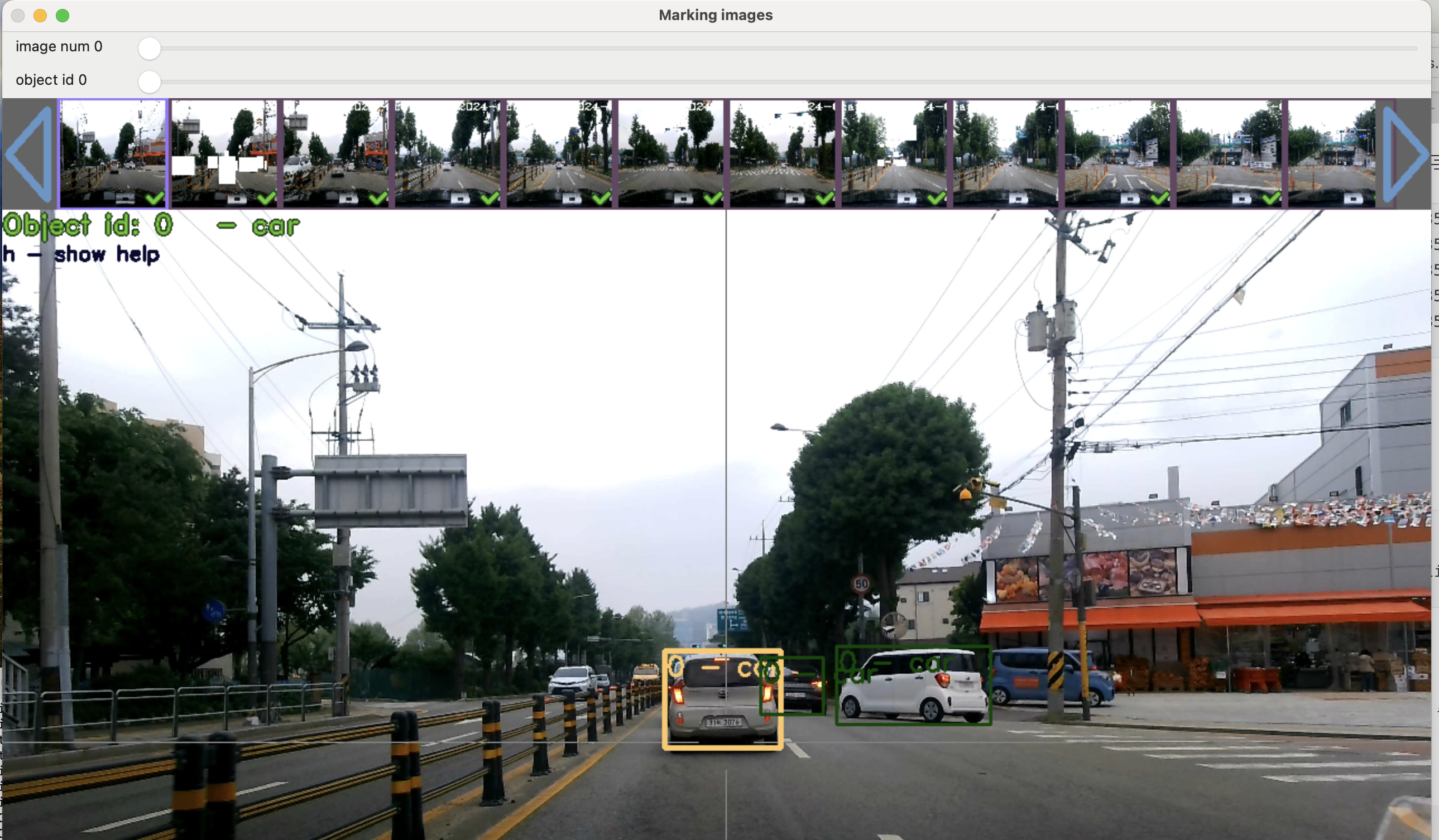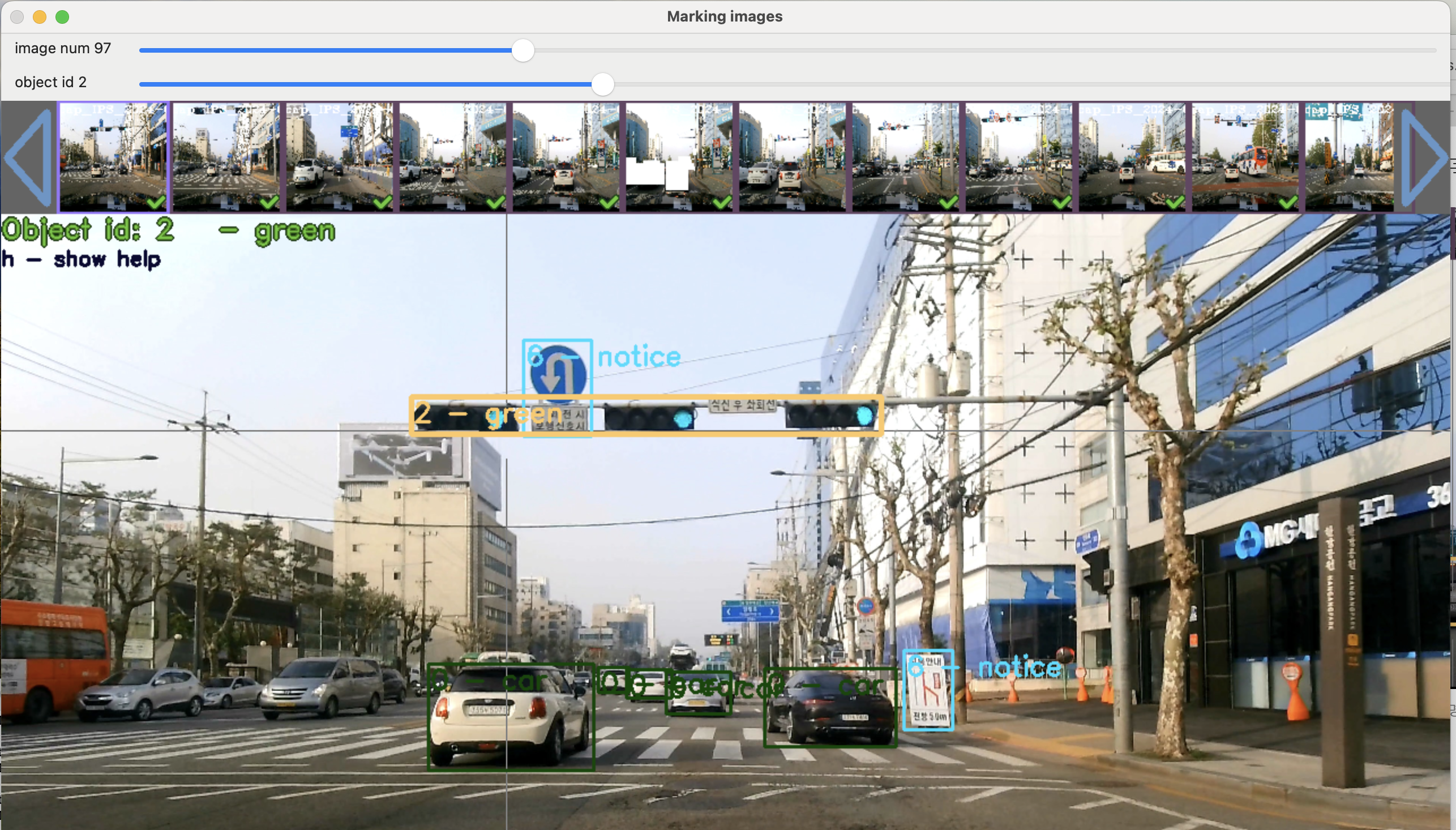실행된 GUI에서 사물(Object ID: 0부터 traffic.objnames에 등록된 순서대로 번호가 매겨진다) 각 사진의 사물마다 사각형으로 표시를 하여 Object-ID를 기록한다.