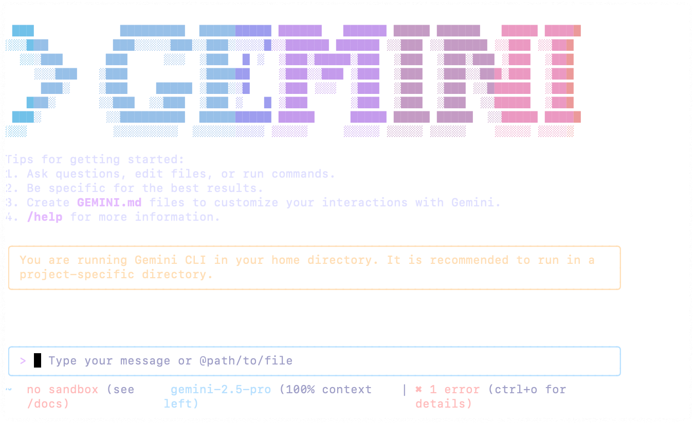 ~ no sandbox (see /docs) gemini-2.5-pro (100% context left)