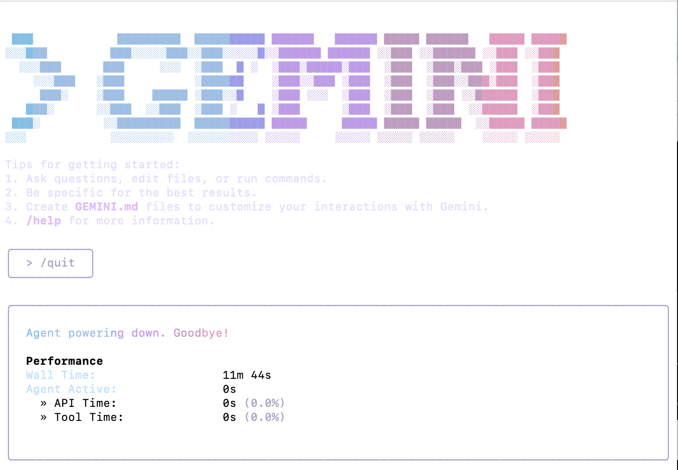 9. 터미널 화면에서는 아래와 같이 Gemini cli 가 사용할 수 있는 준비가 된 상태가 된다.