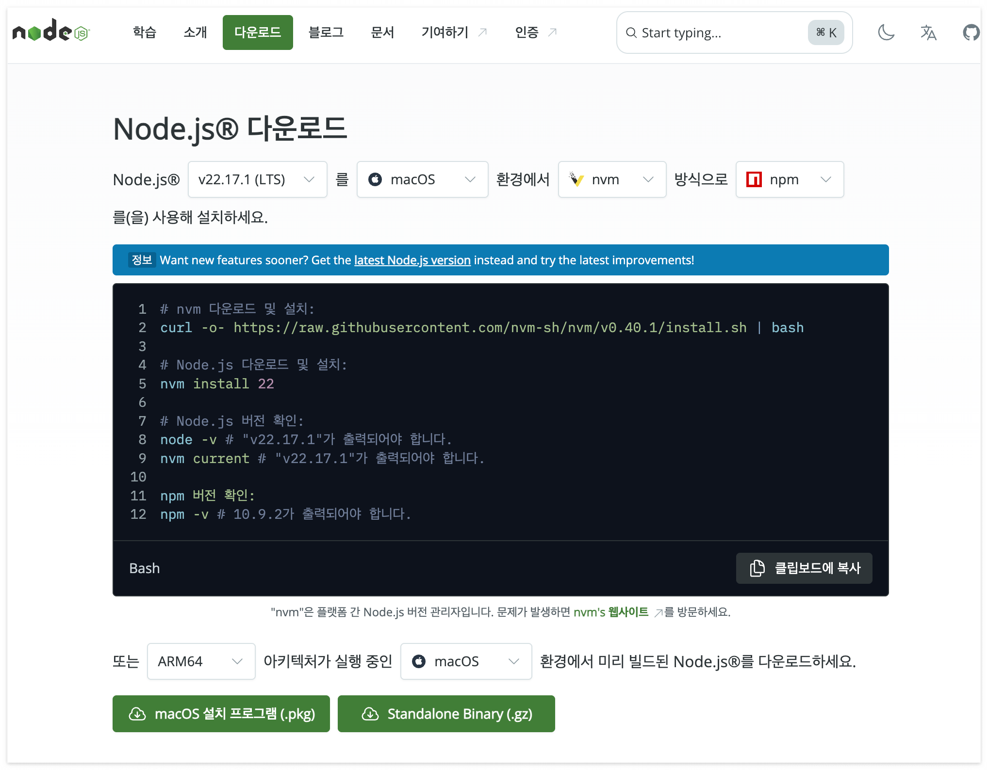 1. node js 홈페이지에 접속해서, nodejs를 설치한다. gemini-cli 사용을 위해서는 nodejs 18 버전 이상을 사용해야 한다.