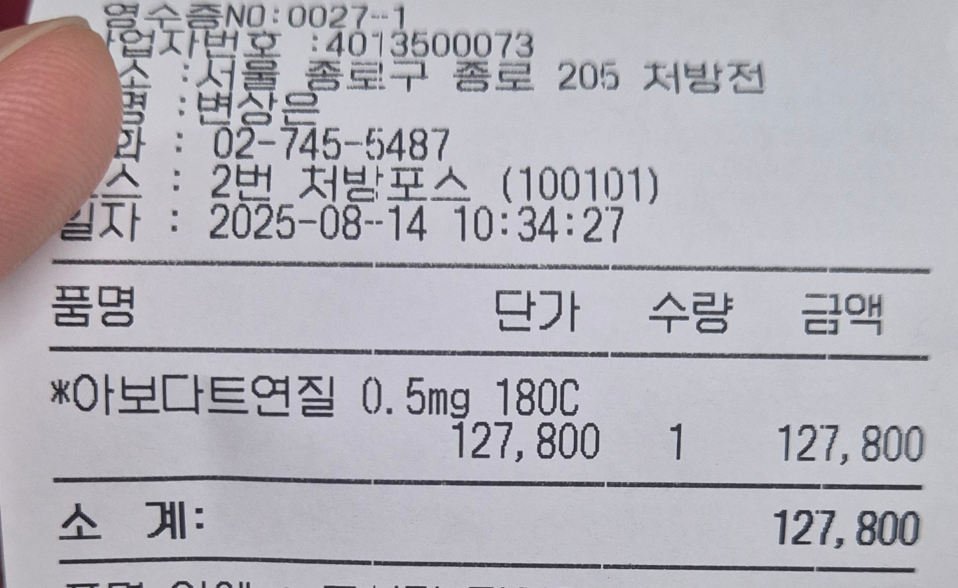 처방약은 카피약은 월 1만원짜리, 아보다트는 월 2만원정도 될거라고 어느약으로 처방해줄까를 묻는다..