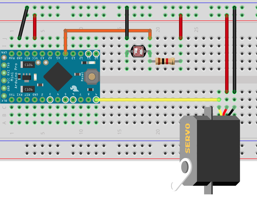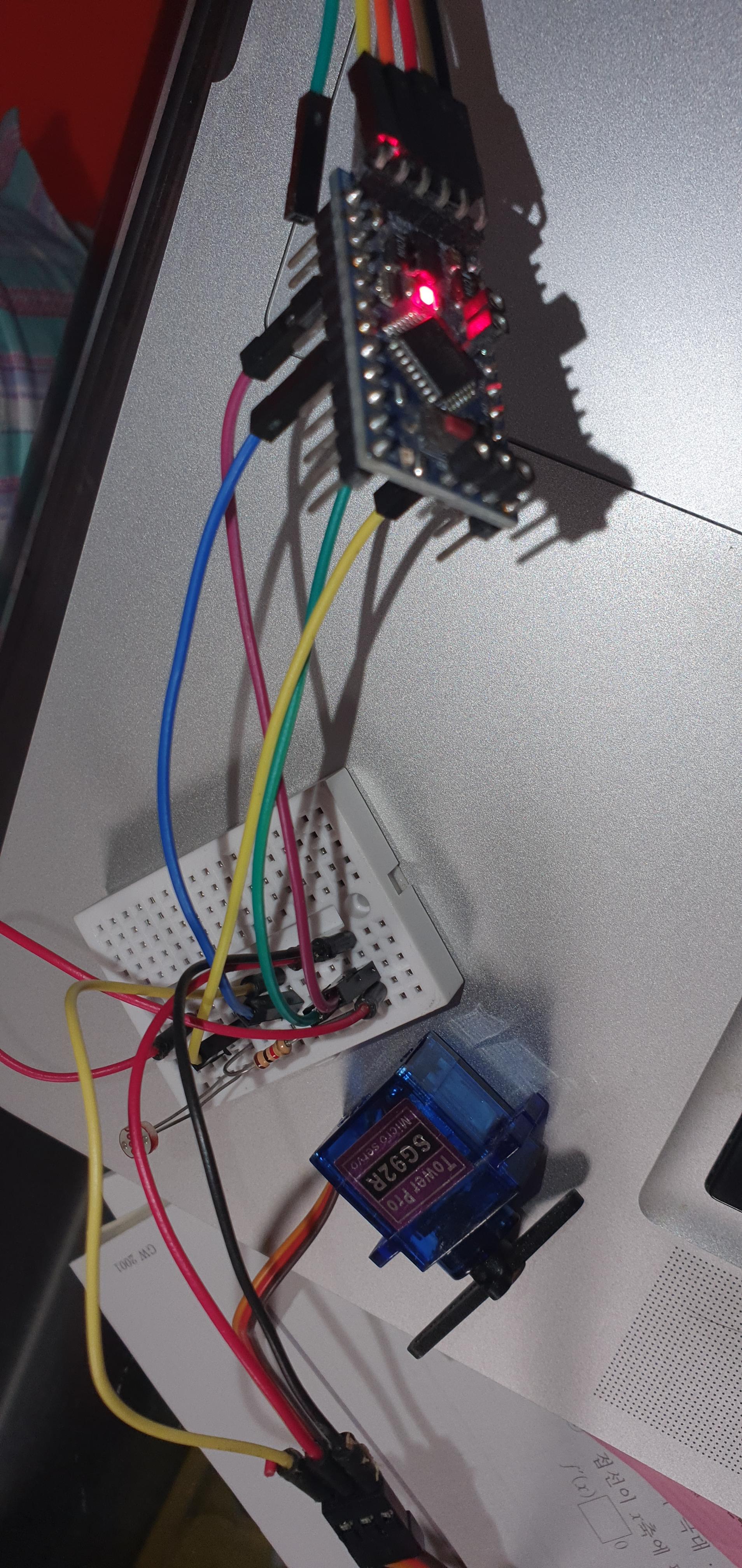 회로 구성은 조도센서와 저항을 연결하여 CdS의 값을 읽어오도록 하고, 그 결과에 따라서 서보모터를 작동할 수 있게 연결했다.