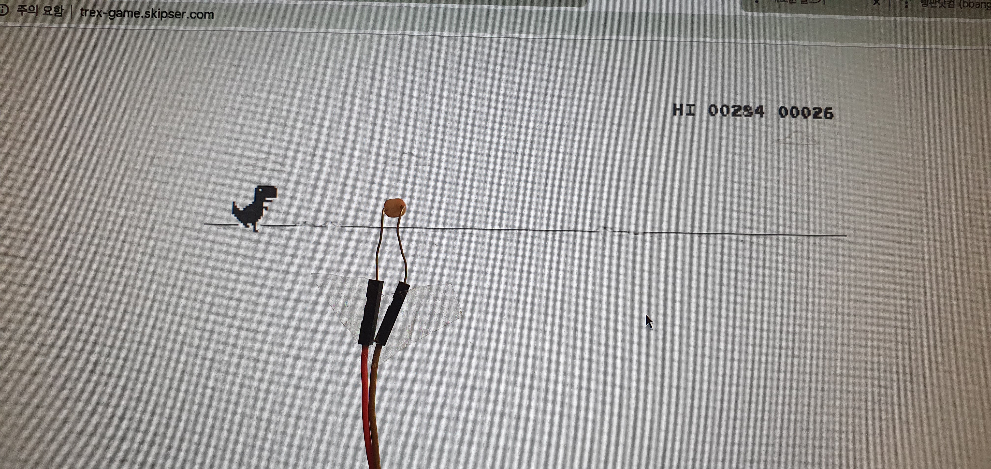 선인장이 나오면 뛰어넘는 게임인데, 아두이노를 이용해서 게임을 대신해주는 동영상을 보고, 아이에게 보여주려고 만들어 봤다.