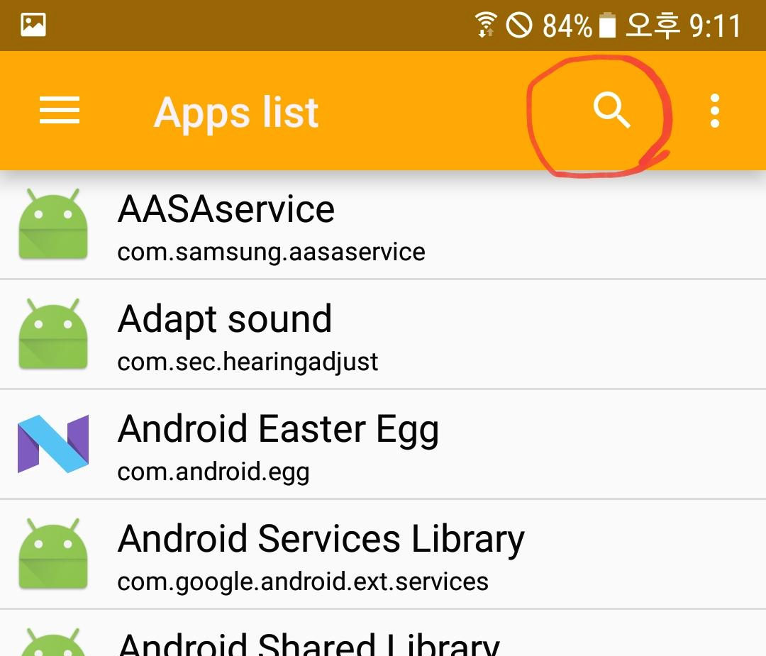 조금전 보다 훨씬 많은 앱 들이 리스팅 되는데, 여기서 삼성 미러링크 앱을 찾아야 하는데, 검색 기능을 사용하여 찾아보자.
