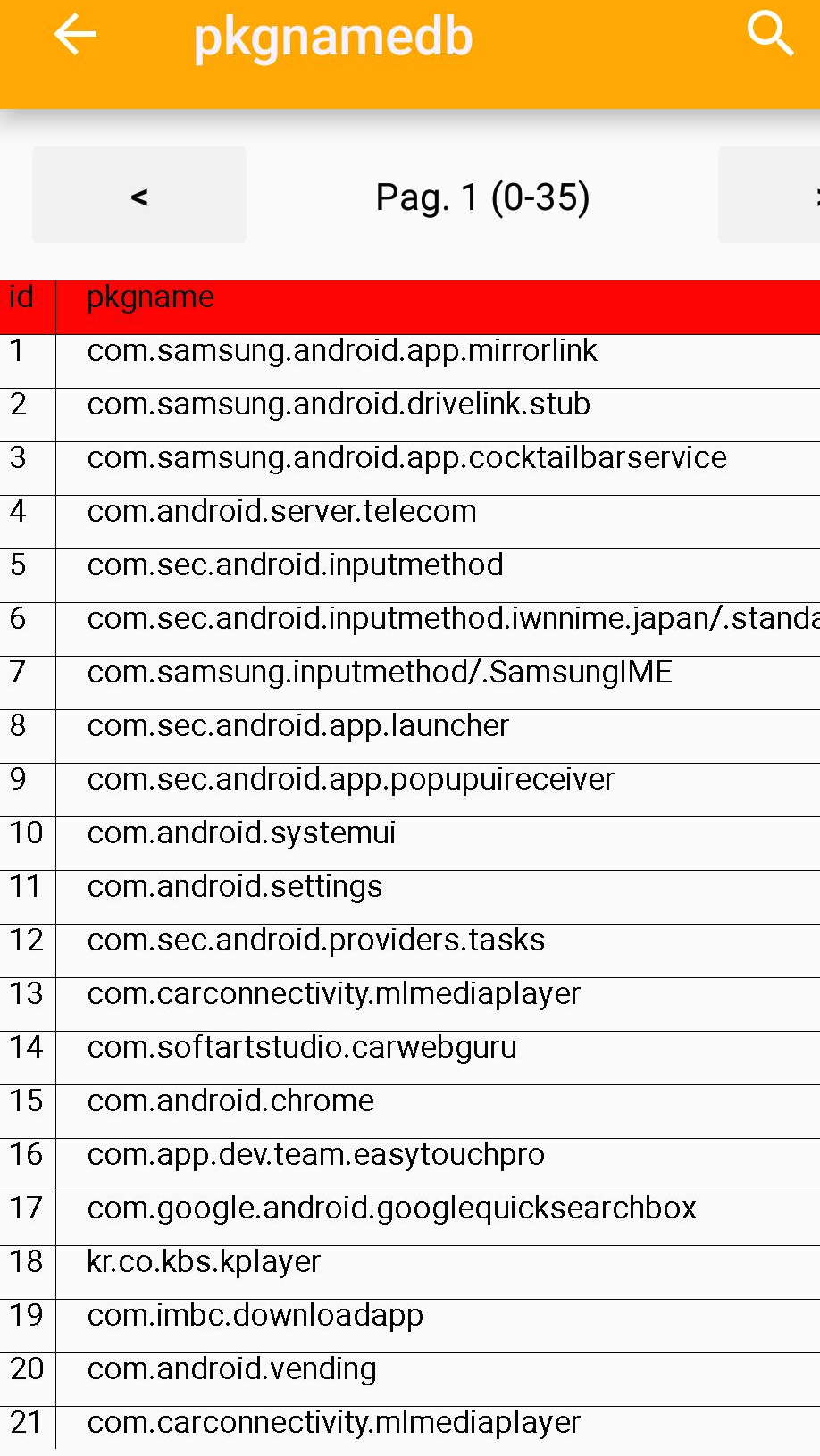 com.softartstudio.carwebguru --> CarWebGuru com.google.android.youtube --> 유튜브 net.cj.cjhv.gs.tving --> 티빙 com.kt.otv --> 올레TV모바일(시즌) com.skt.tmap.ku --> T맵 com.nhn.android.nmap --> 네이버지도 com.google.android.projection.gearhead --> 안드로이드 오토 com.android.chrome --> 크롬브라우저 com.app.dev.teeam.easytouchpro --> Easy Touch kr.co.kbs.kplayer --> KBS my K com.lge.mirrordrive --> LG미러드라이브 com.imbc.downloadapp --> MBC com.android.vending --> Play 스토어 com.google.android.videos --> Play 무비 com.sec.android.app.music --> 삼성 뮤직 kr.co.sbs.videoplayer --> SBS com.tomminosoftware.sqliteeditor --> SQLite Editor com.jnhstudio.tbs_AndroidApp --> TBS com.sec.android.gallery3d --> 갤러리 com.sec.android.app.myfiles --> 내파일 kt.navi --> 원내비 com.google.android.googlequicksearchbox --> 음성검색 com.sec.android.app.sbrowser --> 인터넷 브라우저 com.google.android.apps.maps --> 지도 com.locnall.KimGiSa --> 카카오내비 com.google.android.apps.photos --> 구글포토 com.android.egg --> 구글 안드로이드 이스터 에그 com.smart.swkey.nonroot --> Button Savior (non root) com.carconnectivity.mlmediaplayer --> RockScout