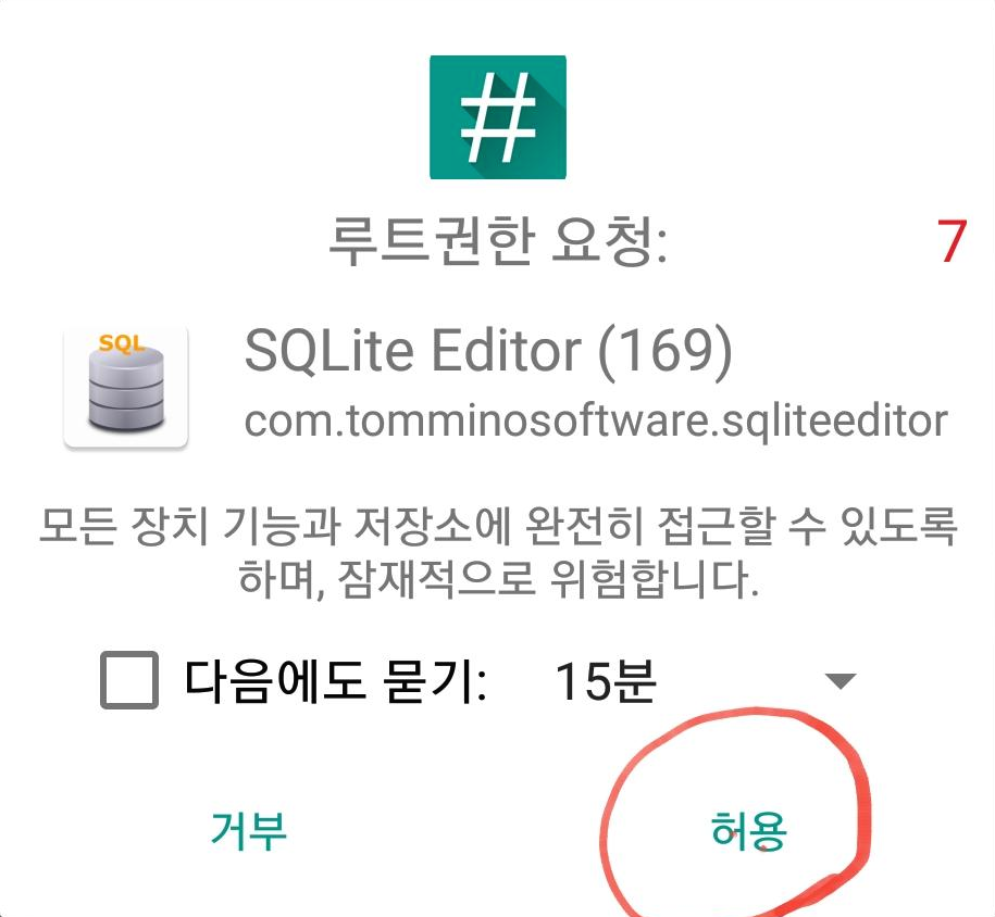 SQLite Editor을 실행하면 나타나는 팝업 화면에서 루트권한을 아래 사진과 같이 선택하여 허용 한다.