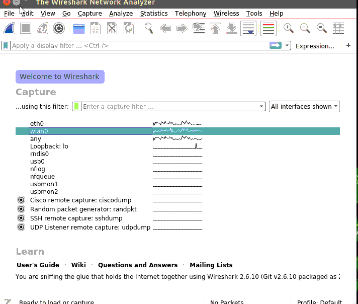 설치가 된 후에, wireshark를 실행하면 된다. 모든 패킷을 수신하기 위해서 root권한으로 실행해야 된다. GUI의 메뉴에서 wireshark를 실행하여 무선랜의 캡처를 한다고 하면 오류가 나면서 "sudo dpkg-reconfigure wireshark-common"을 실행하고, "Yes"를 선택하라는 메시지가 나온다. 이것을 그대로 따라한 후에 wireshark를 실행하면 wlan0를 선택하지 못했었다. 만일 이렇게 했다면, 다시 위의 명령어를 실행해서, "No"를 선택하도록 한다.