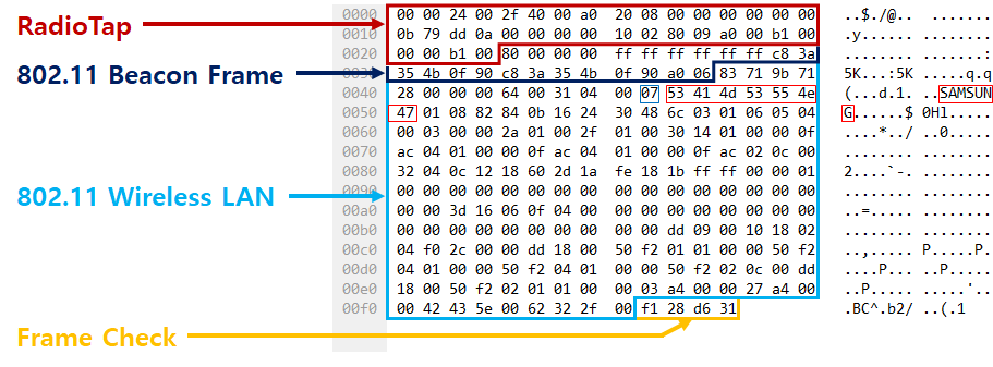 위에서 위치가 맞지 않는 원인은 RadioTap의 Strucure가 가변적으로 변화하는 것을 알지 못한 문제였다. radiotab의 총 4바이트 안에 RadioTap의 길이정보가 있는데, 헤더를 포함한 길이로 이를 제외하고 나면, BeaconFrame영역이 된다.