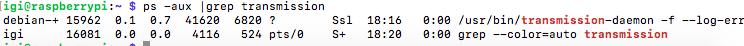 2) 정상적으로 transmission-daemon이 수행되었는지를 아래의 명령어로 확인한다. 정상적으로 기동되었을 때는 아래의 사진과 유사하게 나온다.
