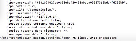 "rpc-password": "{681e9ac475f2161a5280a130770d86bbd7e0e8fcumWefGrj", -> 사용자 계정의 비번, PlainText의 비번을 " "사이에 적어둔 후, transmission-daemon이 실행되면 비밀번호를 왼쪽 처럼 치환한다.