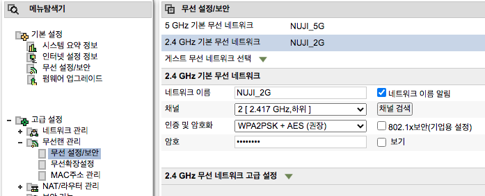 무선공유기의 채널은 공유기의 채널검색을 하여, 주변에 다른 곳에서 사용하지 않는 채널로 설정을 하는 것이 무선속도 저하가 발생하지 않는다. 속도가 갑자기 많이 느려졌다면, 이 채널을 바꿔보면, 속도가 훨씬 빨라졌음을 느낄 것이다.