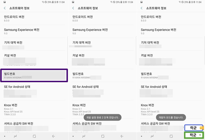 "빌드 버전" 항목을 여러번 터치를 하면 개발자 모드로 변경된다는 메세지가 출력된다.