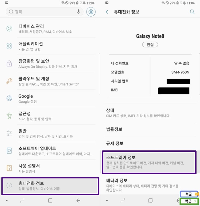 휴대폰의 "설정' 메뉴에서 "휴대전화 정보" --> "소프트웨어 정보" 메뉴를 선택한 후,