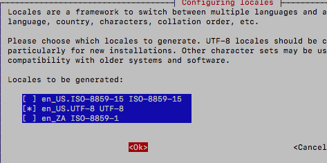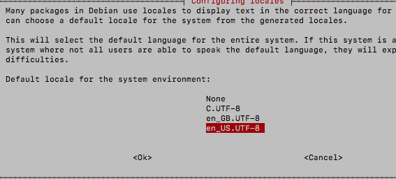 Locale을 en_US.UTF-8 UTF-8 을 선택한다. 한글 출력되는 것을 사용할 필요가 없어서, 영어로 설정하였다. 나중에 이러한 것들은 모두 변경 가능하다.