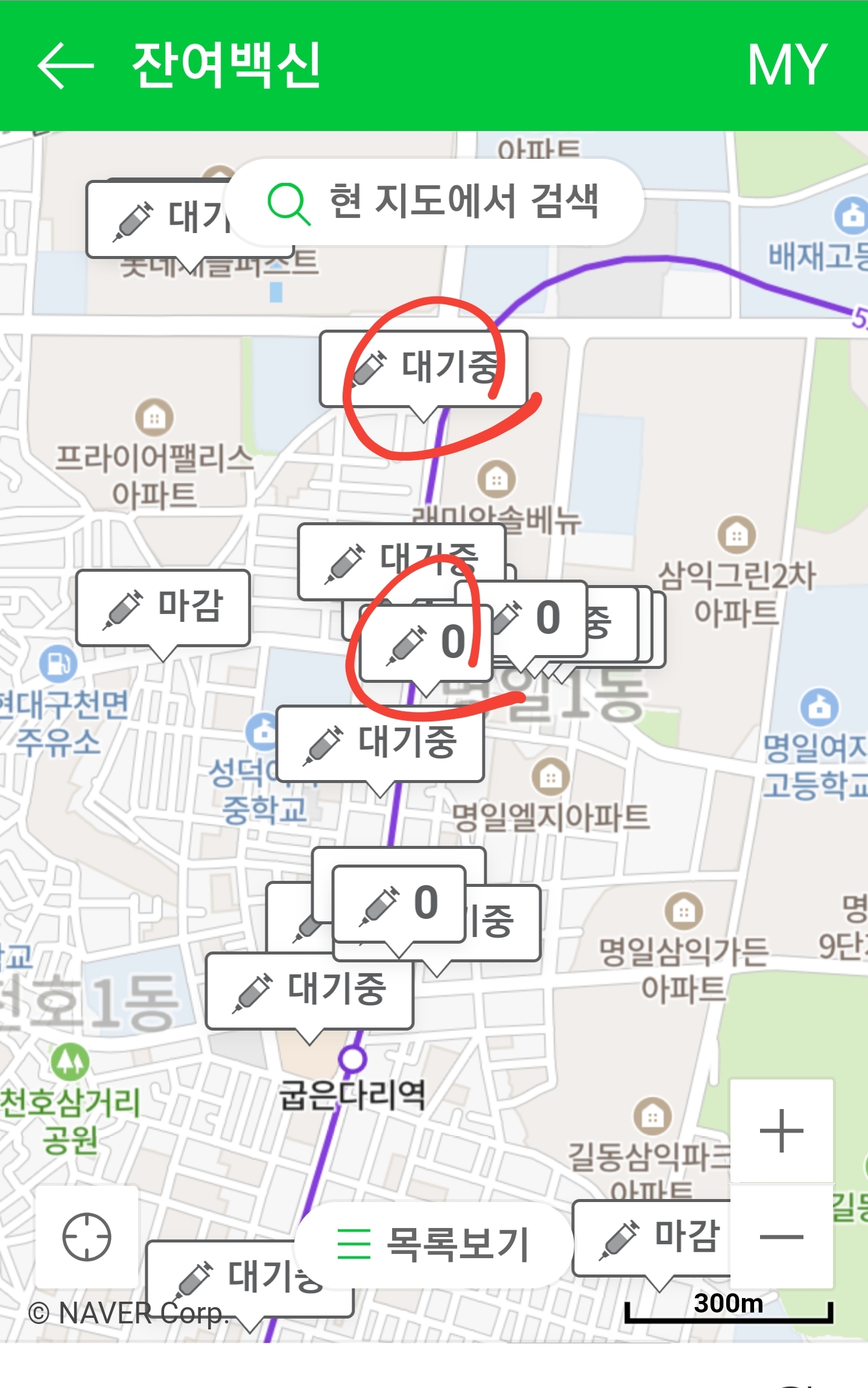근처 지역의 병원에 남은 잔여백신 현황이 나타난다. 병원은 지도를 이동 시켜가면서 재검색을 하면 된다. 잔여백신이 '0'건으로 표시된 것은 없는 것으로 생각되고, '대기중'으로 표시된 병원은 당일 잔여백신이 남아있을 가능성이 있는 병원이다. 하지만, 알림 신청할 때는 이러한 상태는 무시하고, 1~2시간 내에 방문할 수 있는 병원을 선택하여, 알림신청을 하자.
