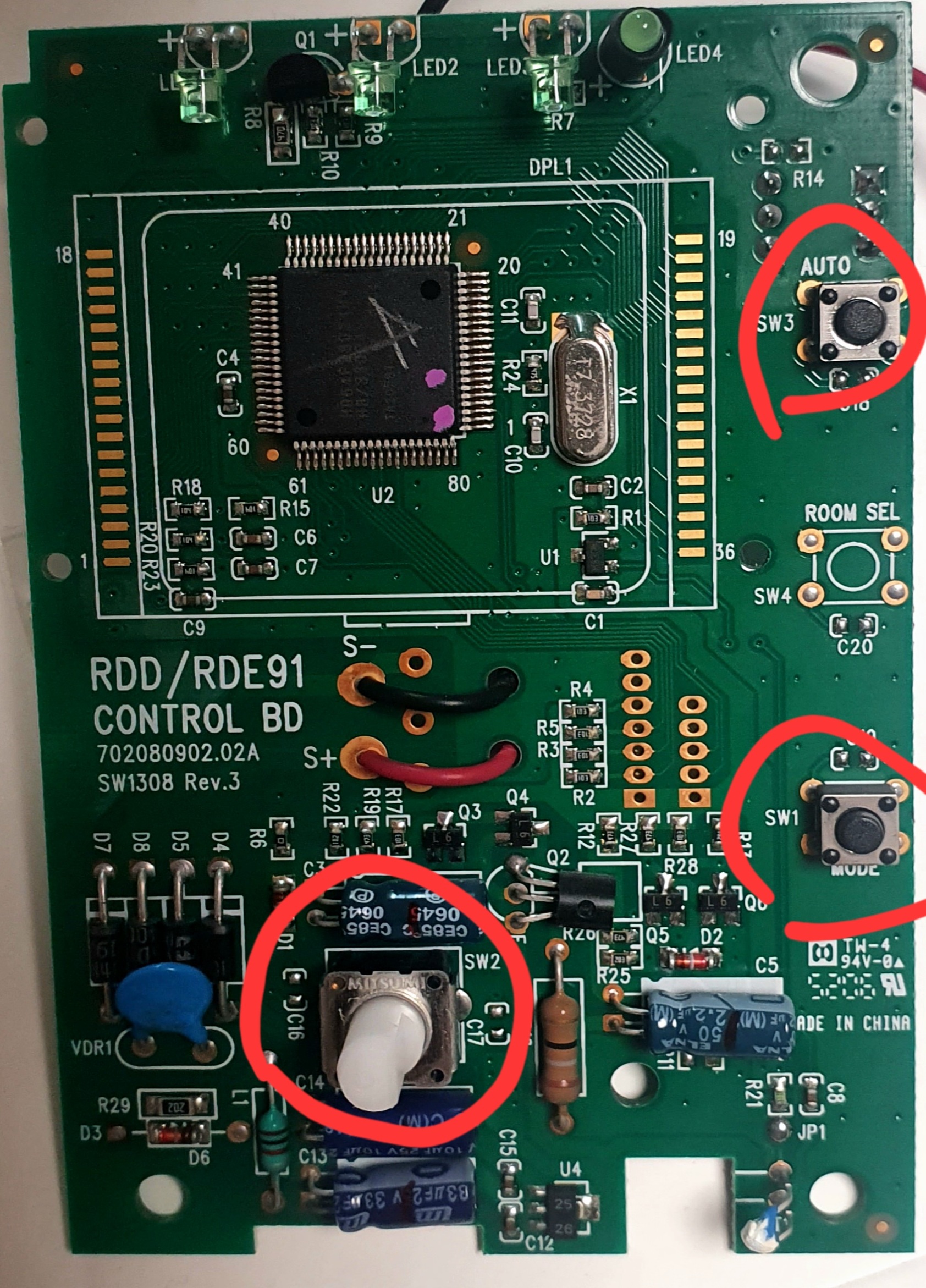때어낸 기판의 반대편의 부품이 있는 사진을 보면 하단 중간에 로터리 스위치가 있고, 우측에 버튼이 2개 또는 3개가 있을 것이다. 거실용은 3개가 있다.